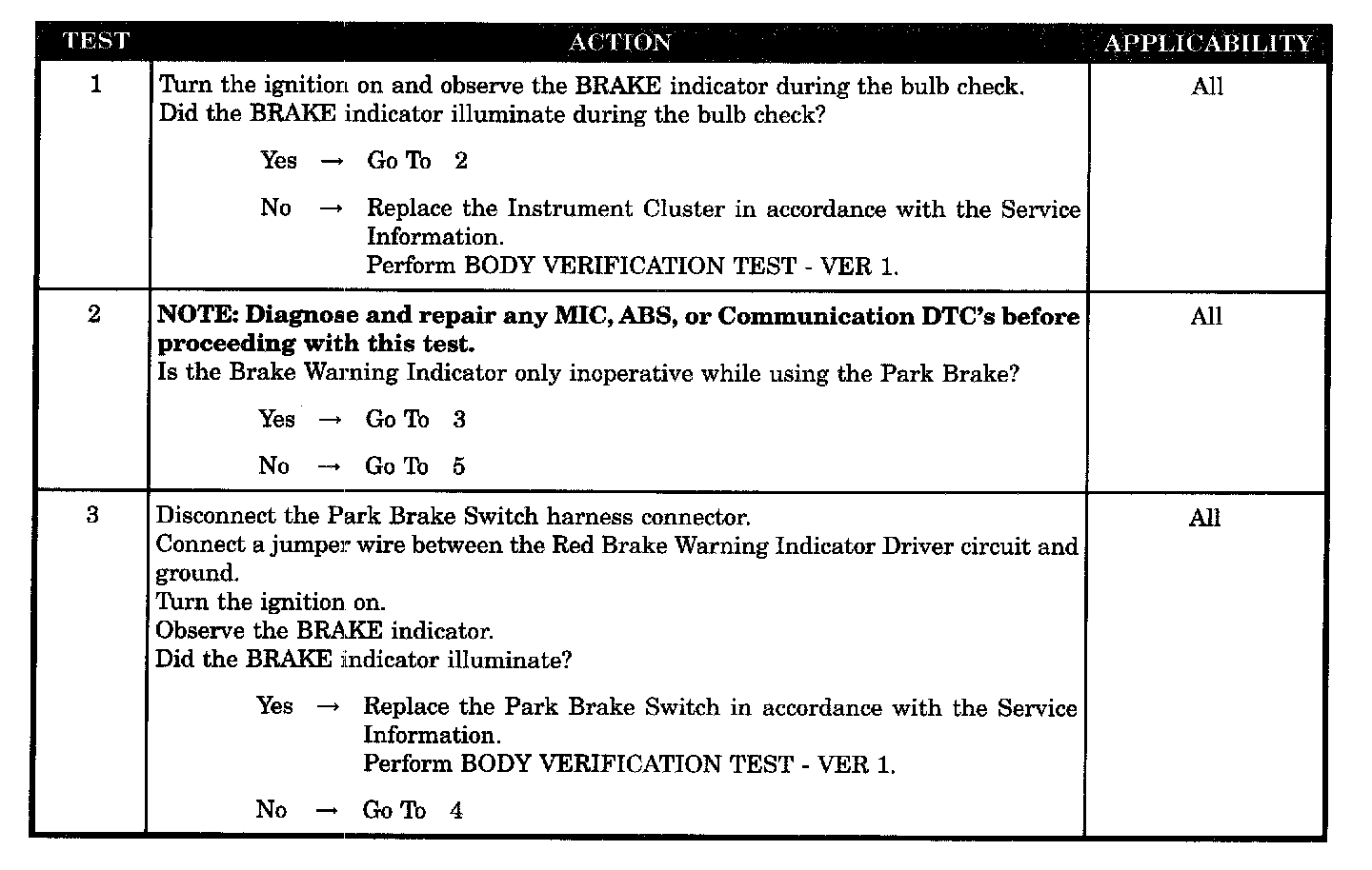 BRAKE WARNING INDICATOR INOPERATIVE