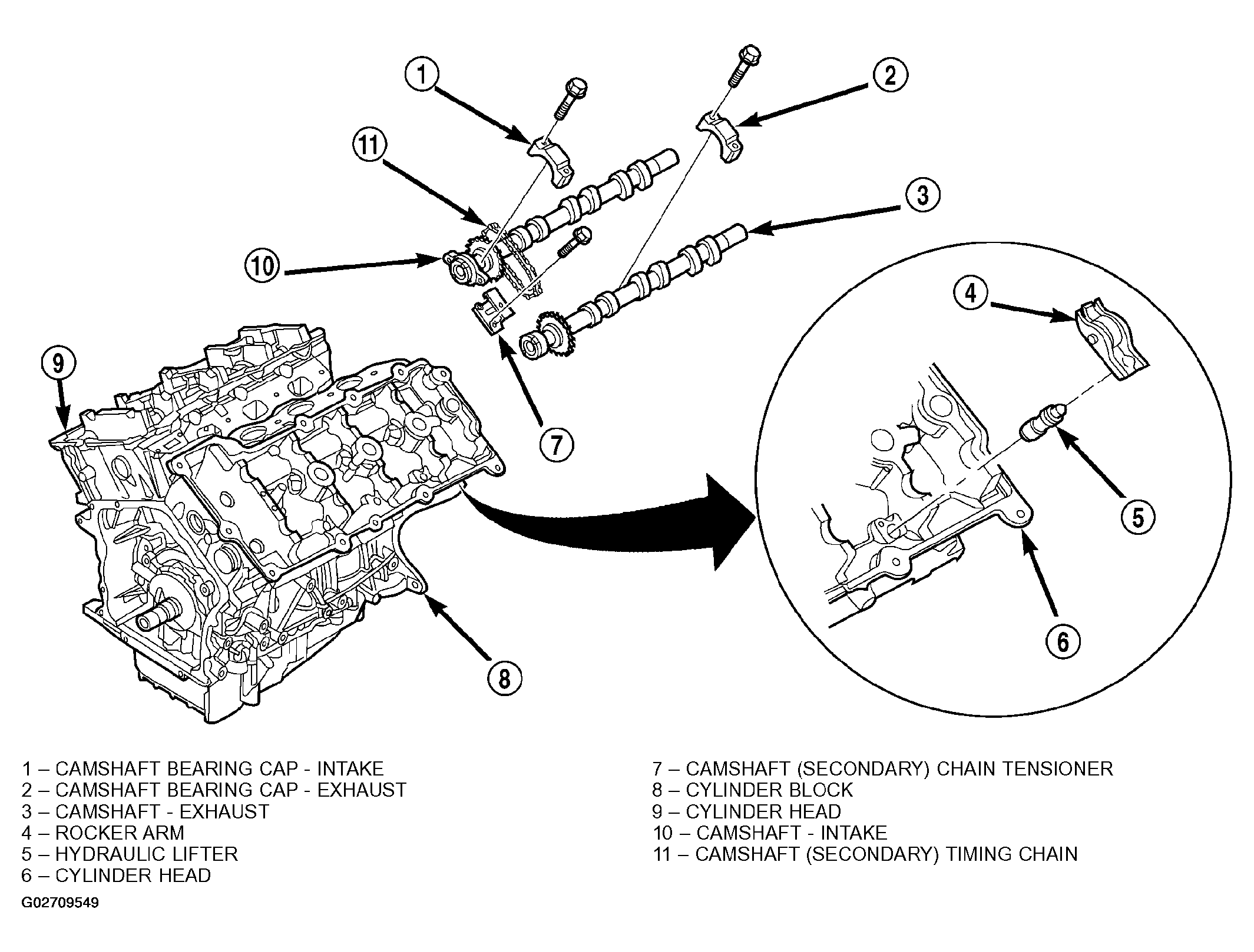 The secondary  timing chain drive system uses two conventional roller-type chains, one at each cylinder bank (Figure). The purpose of the secondary chain is to provide a mechanical driven connection between the intake and exhaust camshafts. The intake camshafts drive the exhaust camshafts. The sprockets for both intake and exhaust camshafts are a press-fit and are only serviced as an assembly with the camshafts.