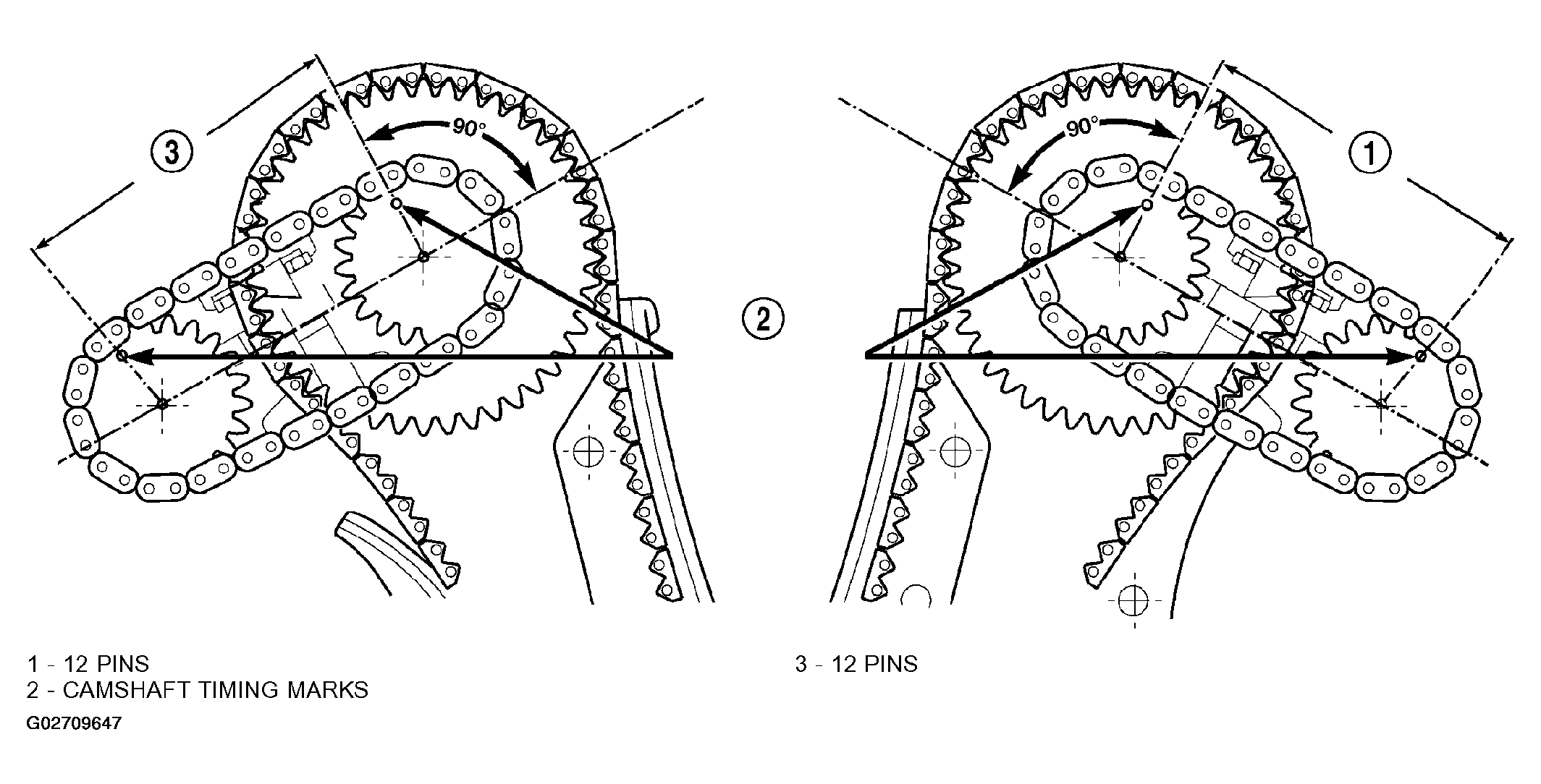 - Count chain pins from the mark on the intake camshaft towards the exhaust camshaft. Engine is timed correctly when there are 12 chain pins between the timing marks on the intake camshaft and exhaust camshaft (Fig 1).