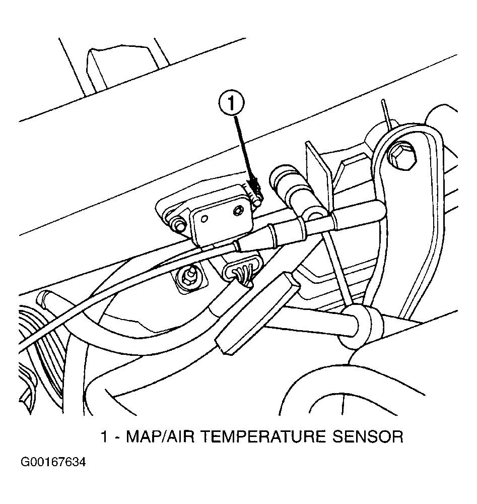 The Manifold Absolute Pressure (MAP) sensor is mounted on the upper intake manifold (plenum). See Fig 1 or Fig 2 . The MAP serves as a PCM input, using a silicone based sensing unit, to provide data on the manifold vacuum that draws the air/fuel mixture into the combustion chamber. The PCM requires this information to determine injector pulse width and spark advance. When MAP equals barometric pressure, the pulse width will be at maximum. A 5-volt reference is supplied to the MAP sensor from the PCM and returns a voltage signal to the PCM that reflects manifold pressure. The zero pressure reading is 0.5 volt and full scale is 4.5 volts. For a pressure swing of 0-15 psi, the voltage changes 4.0 volts. The sensor is supplied a regulated 4.8-5.1 volts to operate the sensor. Like the camshaft and crankshaft position sensors, ground is provided through the sensor return circuit. The MAP sensor input is the number one contributor to pulse width. The most important function of the MAP sensor is to determine barometric pressure. The PCM needs to know if the vehicle is at sea level or is it 5000 feet above sea level, because the air density changes with altitude. It will also help to correct for varying weather conditions. If a hurricane was coming through the pressure would be very, very low or there could be a real fair weather, high pressure area. This is important because as air pressure changes the barometric pressure changes. Barometric pressure and altitude have a direct inverse correlation, as altitude goes up barometric pressure goes down. The first thing that happens as the ignition key is turned on, before reaching the crank position, the PCM powers up, and looks at the MAP voltage. Based upon the voltage it sees, it knows the current barometric pressure relative to altitude. Once the engine starts, the PCM looks at the voltage again, continuously every 12 milliseconds, and compares the current voltage to what it was at key on. The difference between current and what it was at key on is manifold vacuum.