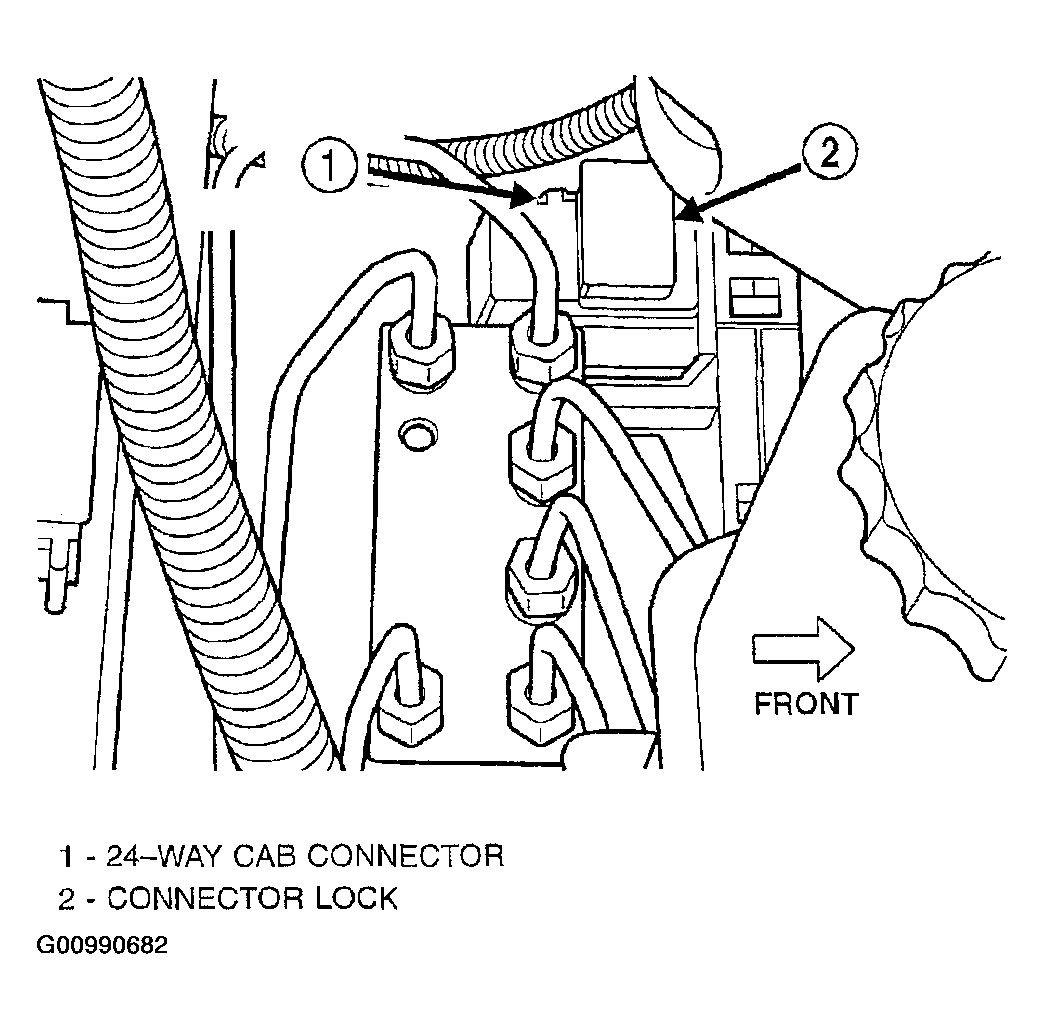 - Lower the vehicle.CAUTION: Before installing the 24-way connector in the CAB be sure that the seal is properly installed in the connector.