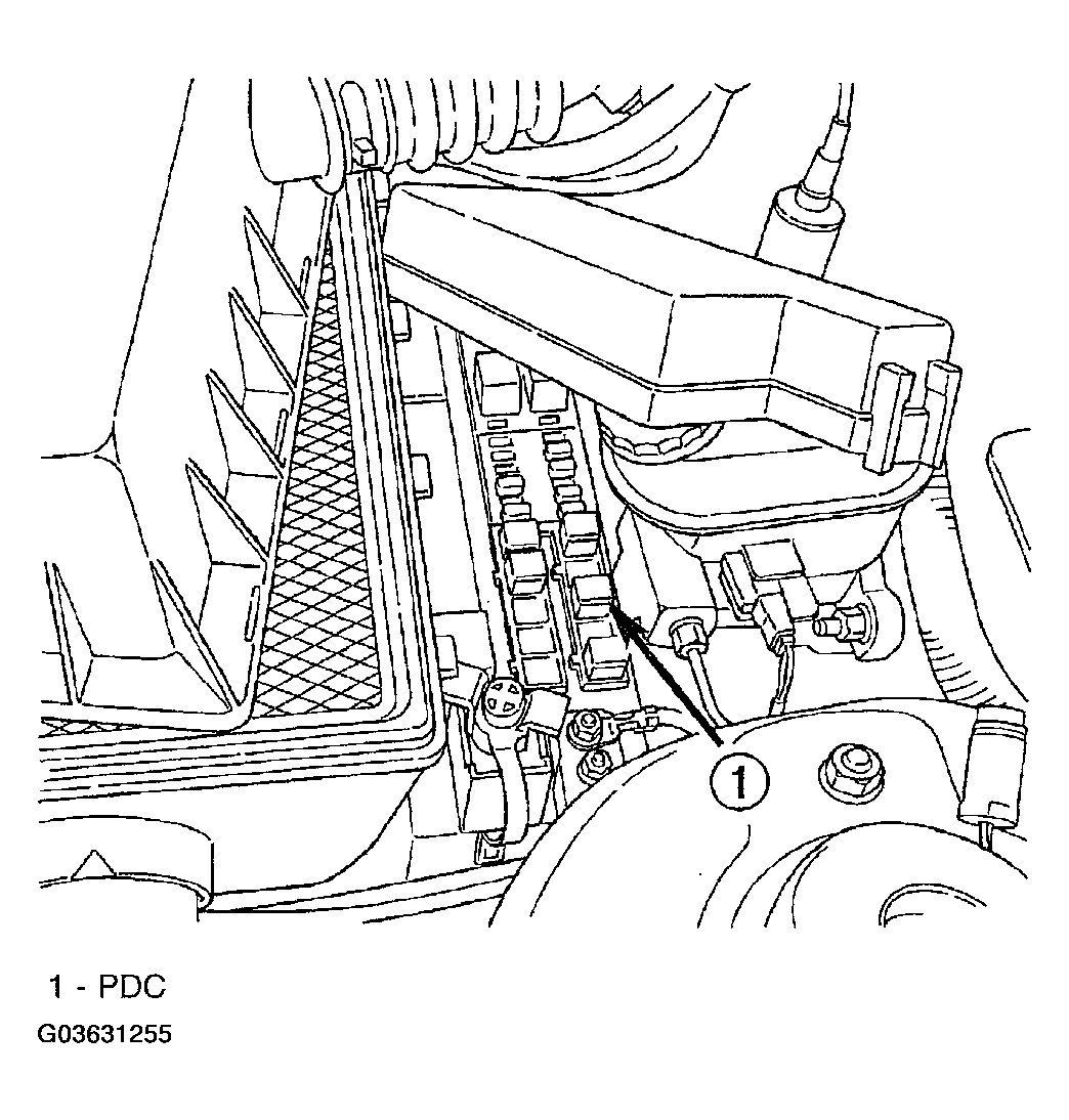 All of the electrical current distributed throughout this vehicle is directed through the standard equipment Power Distribution Center (PDC) (Fig 1 ). The molded plastic PDC housing is located in the left front corner of the engine compartment, just behind the air cleaner housing and the battery. The PDC housing has a molded plastic cover. The PDC cover is easily removed for service access and has a convenient fuse and relay layout label affixed to the inside surface of the cover to ensure proper component identification.