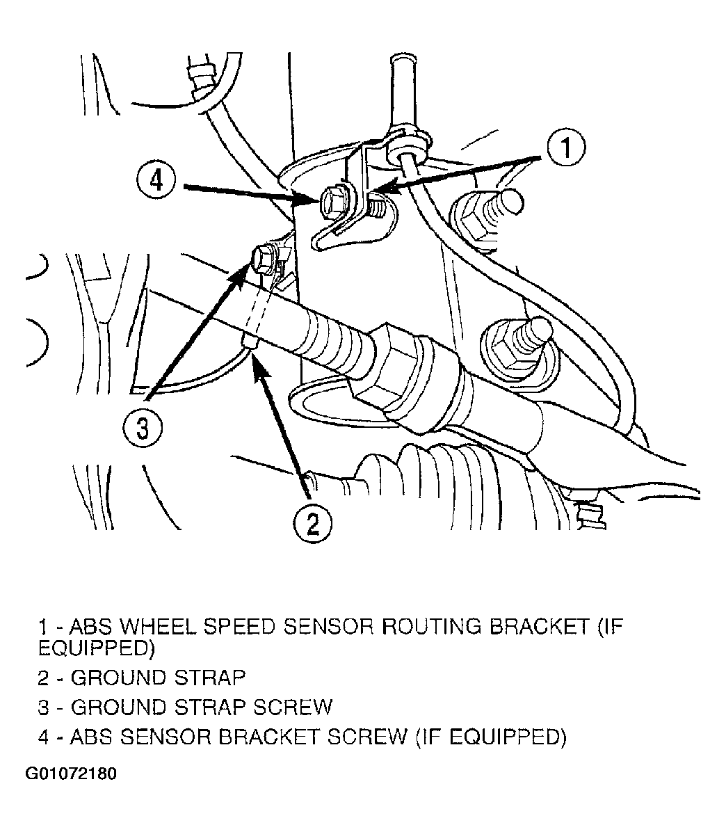 - From the sensor bracket on the strut, loop the sensor cable upward, then downward at the outside of the frame rail. Install the speed sensor cable grommet onto the retaining bracket attached to the brake hose on the outside of the frame rail.