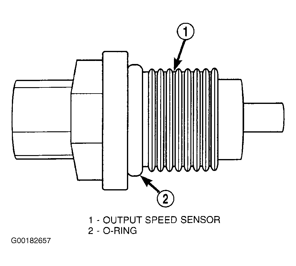 The output speed sensor is a two-wire magnetic pickup device that generates an AC voltage signal as rotation occurs. It is threaded into the transaxle case. See Figure. The output speed sensor is sealed with an "O" ring. See Fig 1. The sensor is considered a primary input to the Transmission Control Module (TCM). The output speed sensor provides information on how fast the output shaft is rotating. As the rear planetary carrier park pawl lugs pass by the sensor coil, an AC voltage is generated and sent to the TCM. See Fig 2. The TCM interprets this information as output shaft RPM.