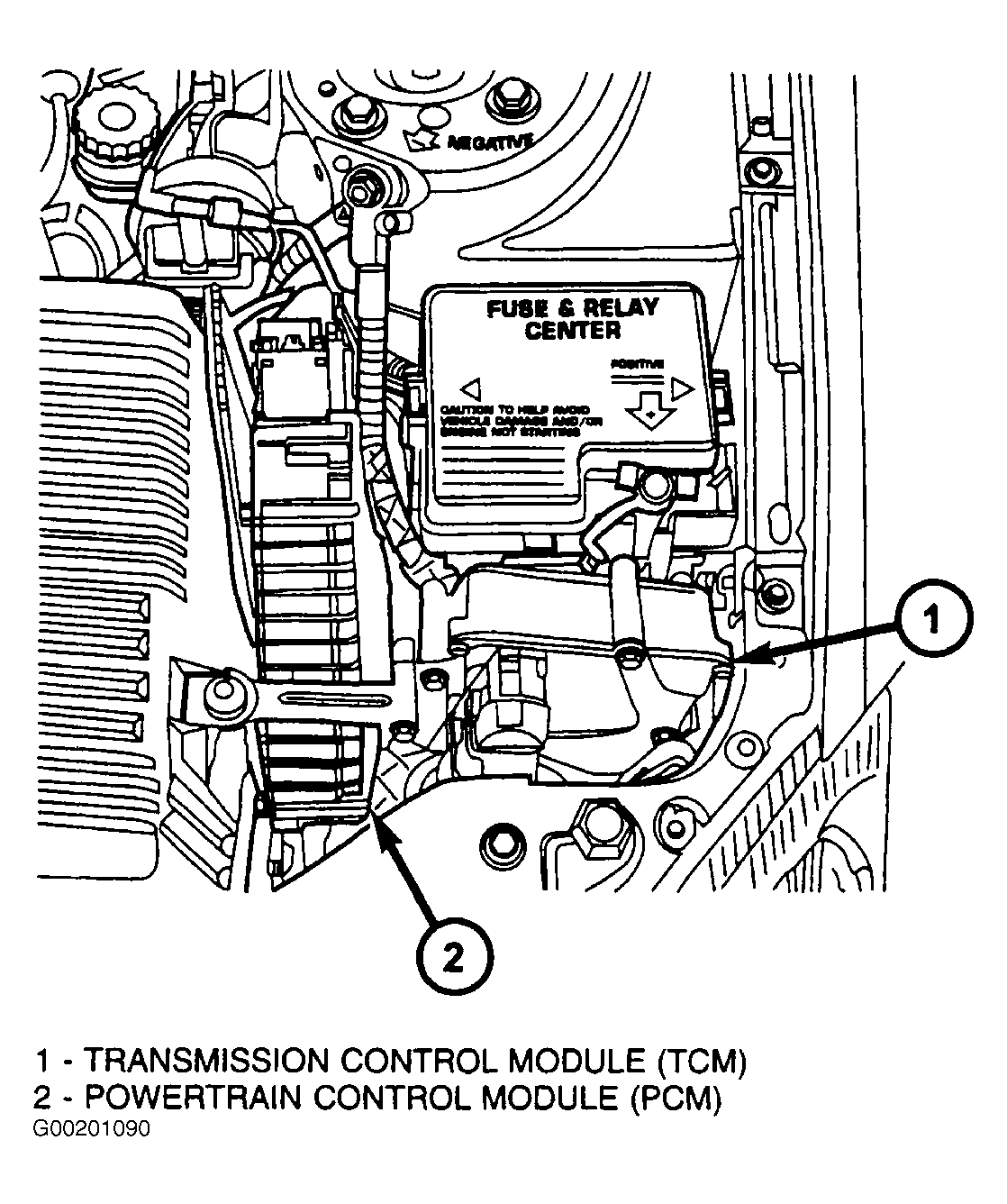 The Transmission Control Module (TCM) is located between the Power Distribution Center (PDC) and the left headlamp assembly in the left side of the engine compartment. See Fig 1. The TCM is the controlling unit for all electronic operations of the transaxle. The TCM receives information regarding vehicle operation from both direct and indirect inputs, and selects the operational mode of the transaxle. Direct inputs are hardwired to, and used specifically by the TCM. Indirect inputs originate from other components/modules, and are shared. with they TCM via the J1850 communication bus. Based on the information received from various inputs, the TCM determines the appropriate shift schedule and shift points, depending on the present operating conditions and driver demand.