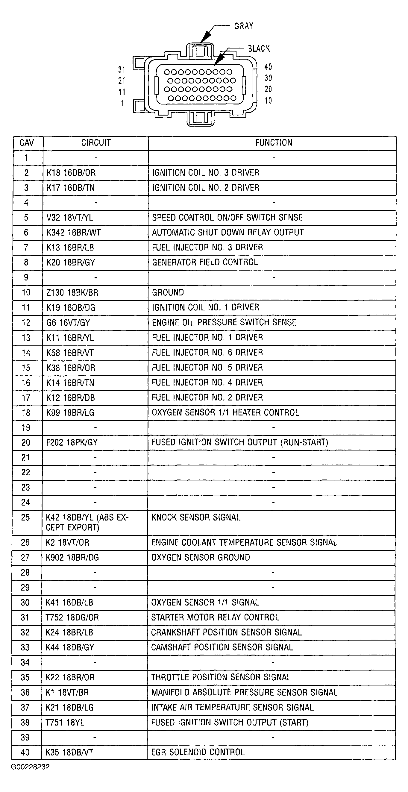 - Turn ignition on. Using a test light connected to ground, probe terminal No. 20 (Pink/Gray wire) at PCM C1 harness connector. See Fig 4 . If test light illuminates brightly, power circuits are okay. Go to next step. If test light does not illuminate brightly, repair open fused ignition switch output circuit (Pink/Gray wire) between PCM and IPM.