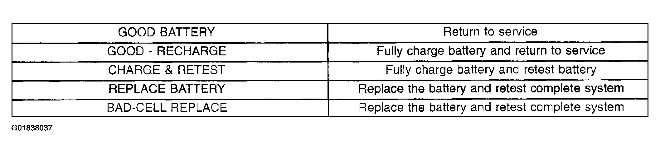 .CAUTION: If REPLACE BATTERY is the result of the test, this may mean a poor connection between the vehicle's cables and battery exists. After disconnecting the vehicle's battery cables from the battery, retest the battery using the OUT-OF-VEHICLE test before replacing.