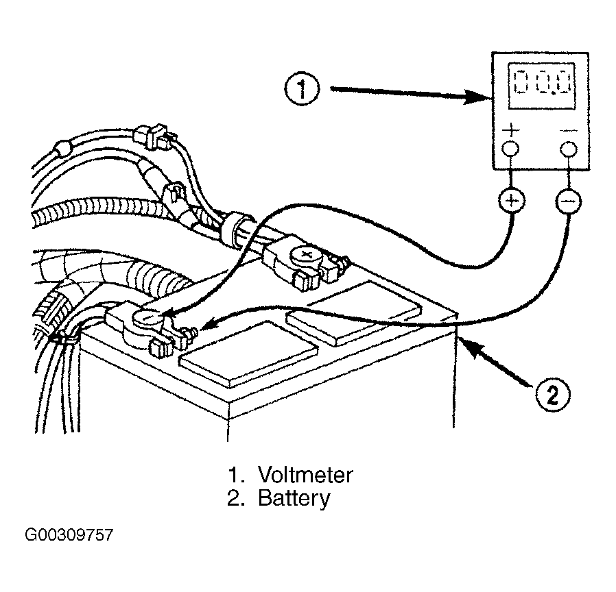 - Connect the positive lead of the voltmeter (1) to the battery (2) negative terminal post. Connect the negative lead of the voltmeter (1) to the battery (2) negative cable clamp. Rotate and hold the ignition switch in the Start position. Observe the voltmeter. If voltage is detected, correct the poor contact between the cable clamp and the terminal post. See Fig 1 .