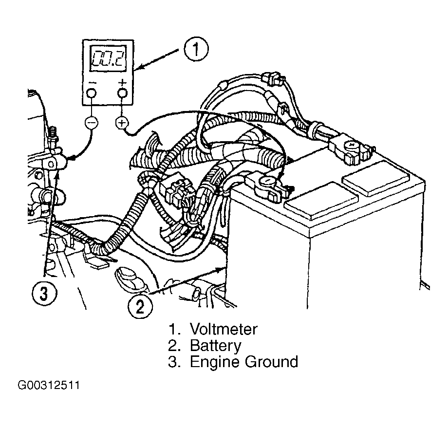 - Connect the voltmeter (2) to measure between the battery (1) positive terminal post and the starter (3) solenoid battery terminal stud. Rotate and hold the ignition switch in the Start position. Observe the voltmeter. If the reading is above 0.2 volt, clean and tighten the battery cable connection at the solenoid. Repeat the test. If the reading is still above 0.2 volt, replace the faulty battery positive cable. See Fig 3 .