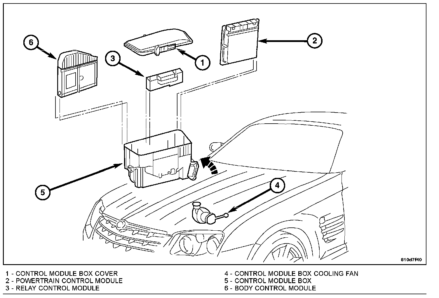 3. Holding the metal powertrain control module retaining clip back, pull the powertrain control module (2) up and out of the control module box (5).