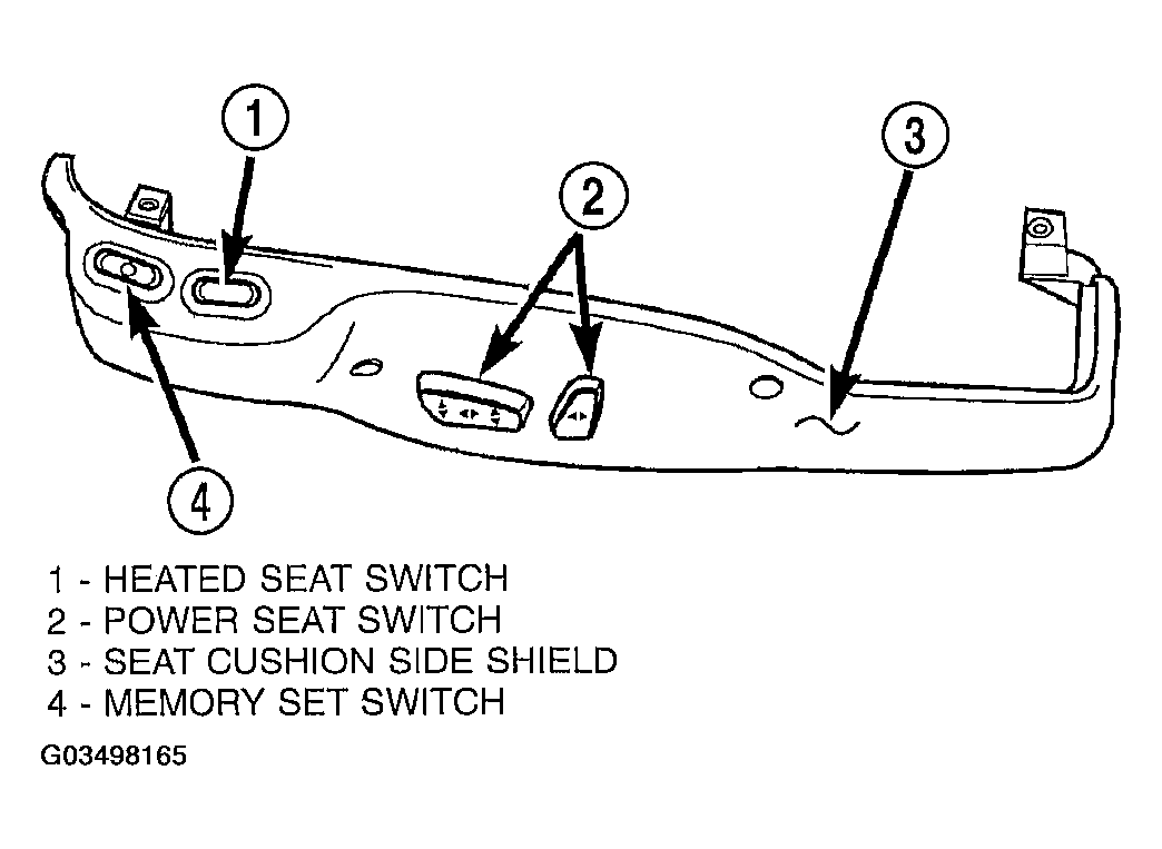 SOME VEHICLES ARE EQUIPPED WITH SEATBACK MOUNTED AIRBAGS. BEFORE ATTEMPTING TO DIAGNOSE OR SERVICE ANY SEAT OR POWER SEAT SYSTEM COMPONENT YOU MUST FIRST DISCONNECT AND ISOLATE THE BATTERY NEGATIVE CABLE. THEN WAIT TWO MINUTES FOR THE SYSTEM CAPACITOR TO DISCHARGE BEFORE FURTHER SYSTEM SERVICE. THIS IS THE ONLY SURE WAY TO DISABLE THE AIRBAG SYSTEM. FAILURE TO DO SO COULD RESULT IN ACCIDENTAL AIRBAG DEPLOYMENT AND POSSIBLE PERSONAL INJURY.