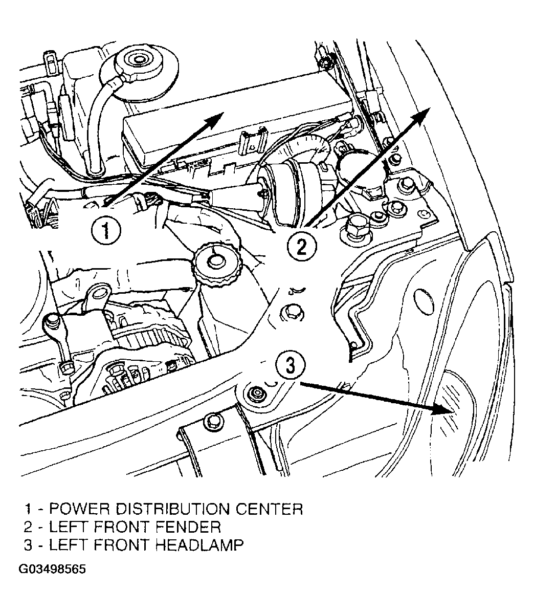 All of the electrical current distributed throughout this vehicle is directed through the standard equipment Power Distribution Center (PDC) (Fig 1 ). The molded plastic PDC housing is located in the left front corner of the engine compartment, just in front of the coolant reservoir bottle. The PDC housing has a molded plastic cover. The PDC cover is easily removed for service access and has a convenient fuse and relay layout label affixed to the inside surface of the cover to ensure proper component identification. The PDC housing is secured in the engine compartment by one screw to the rear of the PDC and two clips on the front side. A small molded plastic protective cover on the front right side of the engine compartment is unsnapped to access the battery/generator cable input connection studs.