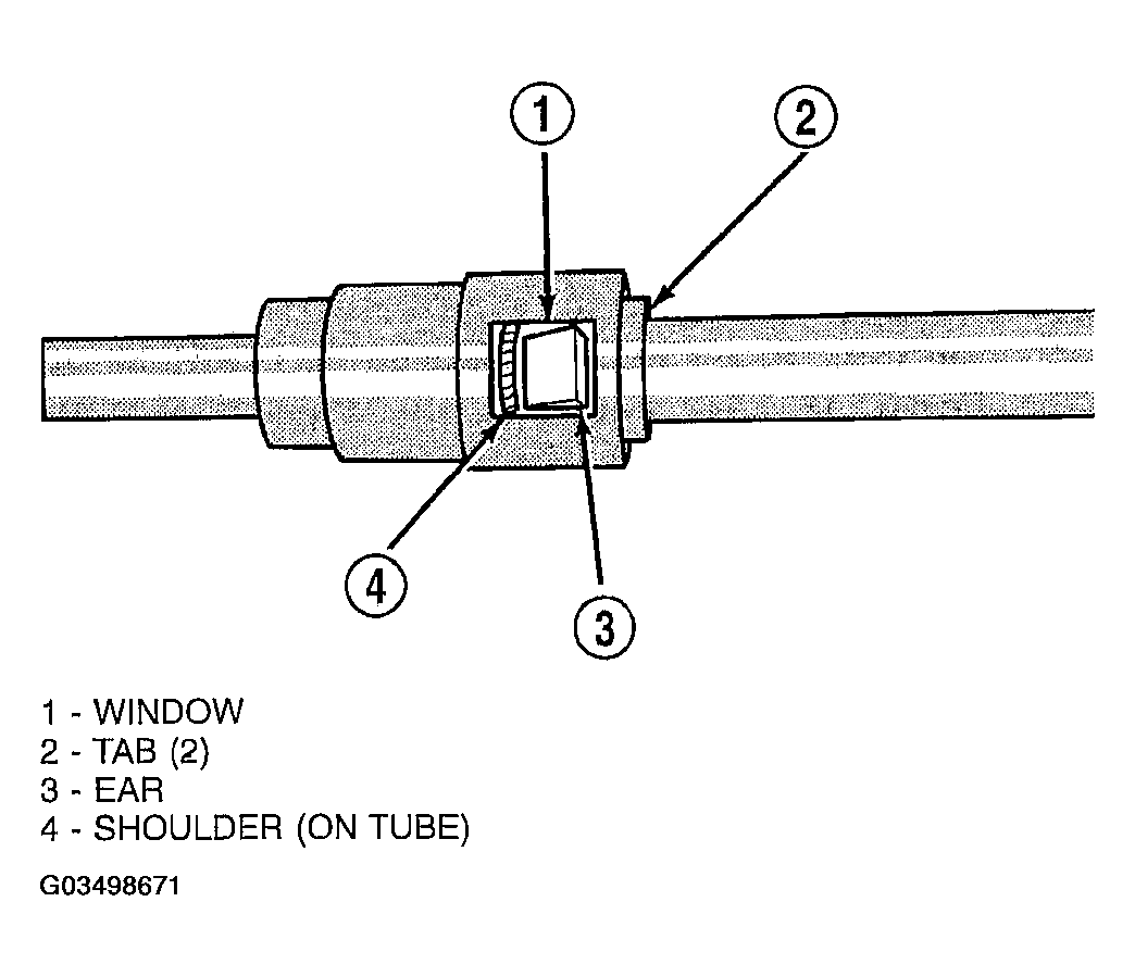 - The plastic quick-connect fitting has windows in the sides of the casing. When the fitting completely attaches to the fuel tube, the retainer locking ears and the fuel tube shoulder are visible in the windows. If they are not visible, the retainer was not properly installed (Fig 1). Do not rely upon the audible click to confirm a secure connection.