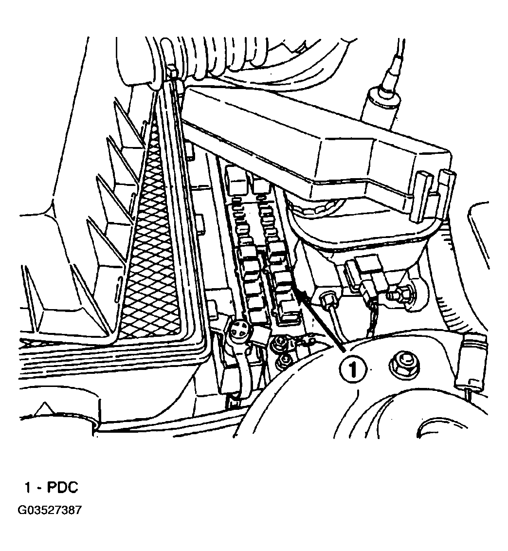 All of the electrical current distributed throughout this vehicle is directed through the standard equipment Power Distribution Center (PDC) (Fig 1 ). The molded plastic PDC housing is located in the left front corner of the engine compartment, just behind the air cleaner housing and the battery. The PDC housing has a molded plastic cover. The PDC cover is easily removed for service access and has a convenient fuse and relay layout label affixed to the inside surface of the cover to ensure proper component identification.