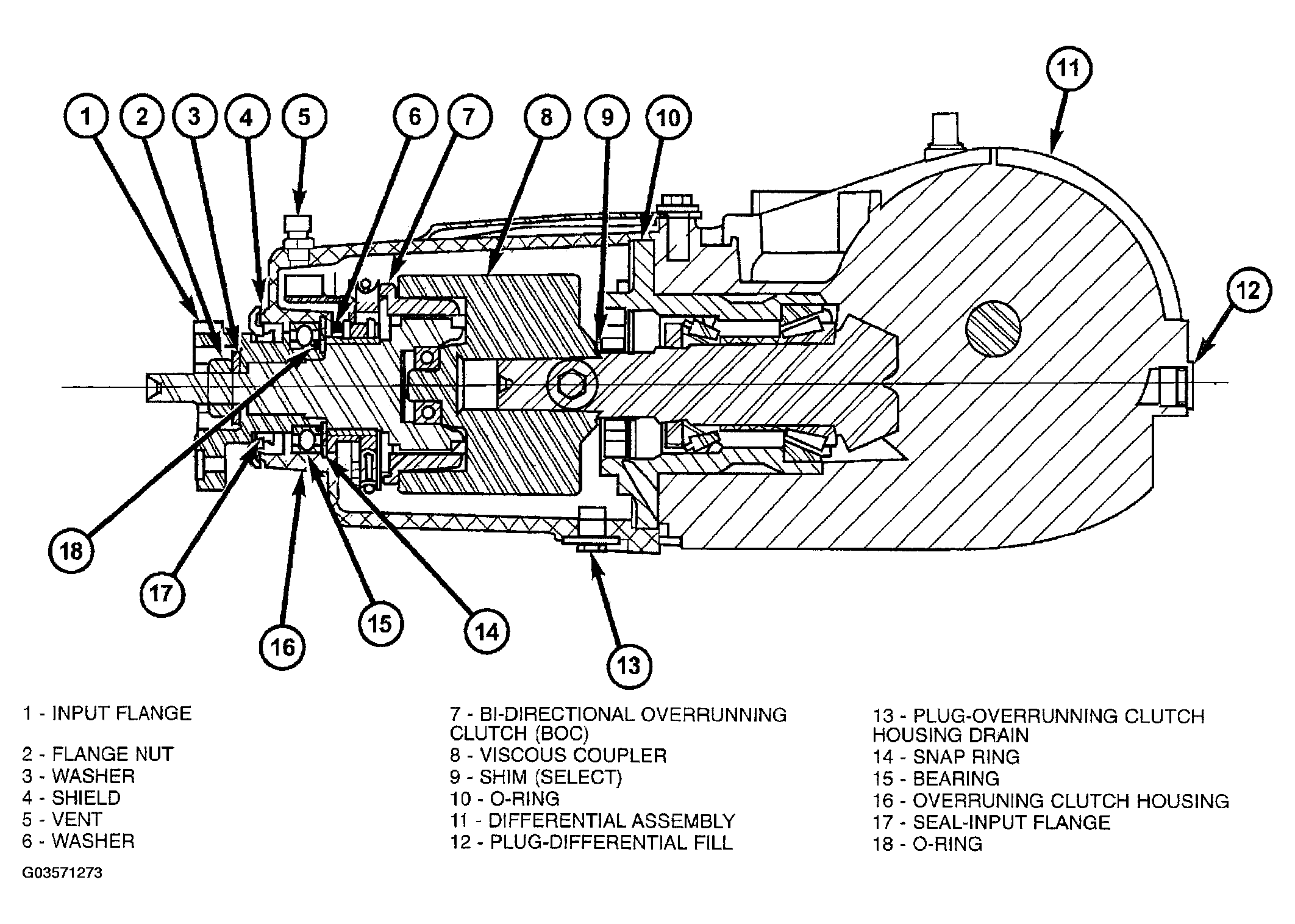 The viscous coupling and bi-directional overrunning clutch are contained within an overrunning clutch housing, which fastens to the differential assembly. The overrunning clutch housing and differential assembly have unique fluid sumps, each requiring their own type and capacity of fluid. The overrunning clutch housing requires Mopar(R) ATF+4. The differential assembly requires Mopar(R) 75W-90 Gear and Axle Lubricant.