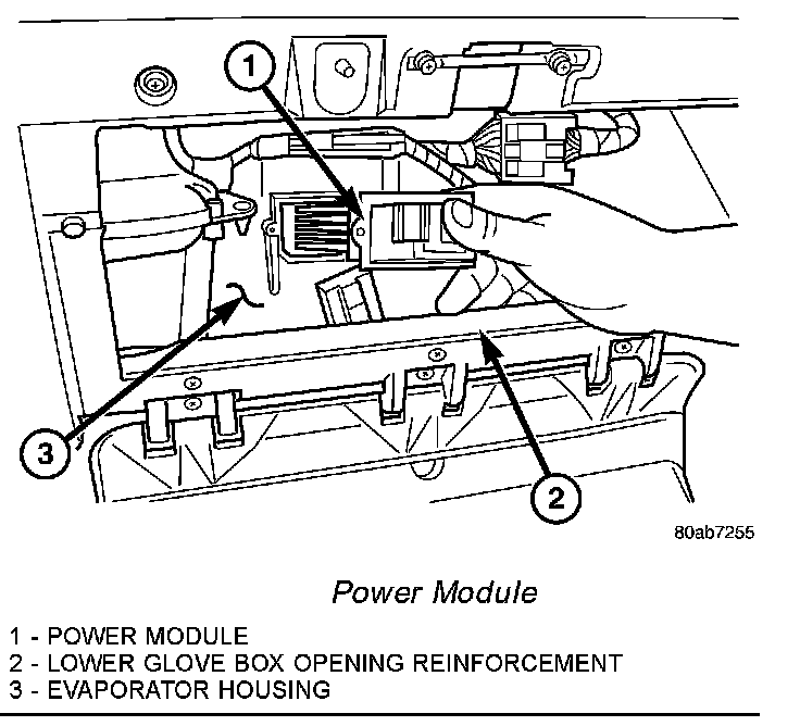 A blower power module is used on this model.The blower power module is installed in a mounting hole in the evaporator housing, directly behind the glove box opening of the instrument panel. The module consists of a molded plastic mounting plate with two integral connector receptacles. Concealed behind the mounting plate within the evaporator housing is the power module electronic circuitry and a large finned, heat sink. The module mounting plate is secured with two screws to the evaporator housing and is accessed for service by rolling down the glove box from the instrument panel.