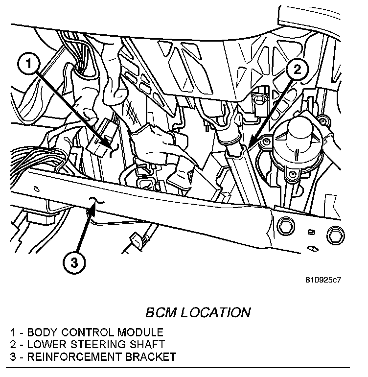 The Body Control Module (BCM) is located on the bulkhead left side, underneath the instrument panel. The BCM utilizes integrated circuitry and information carried on the Programmable Communications Interface (PCI) data bus network along with many hard wired inputs to monitor many sensor and switch inputs throughout the vehicle. In response to those inputs, the internal circuitry and programming of the BCM allow it to control and integrate many electronic functions and features of the vehicle through both hard wired outputs and the transmission of electronic message outputs to other electronic modules in the vehicle over the PCI data bus.