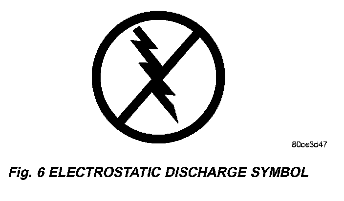 All ESD sensitive components are solid state and a symbol (Fig. 6) is used to indicate this. When handling any component with this symbol, comply with the following procedures to reduce the possibility of electrostatic charge build up on the body and inadvertent discharge into the component. If it is not known whether the part is ESD sensitive, assume that it is.