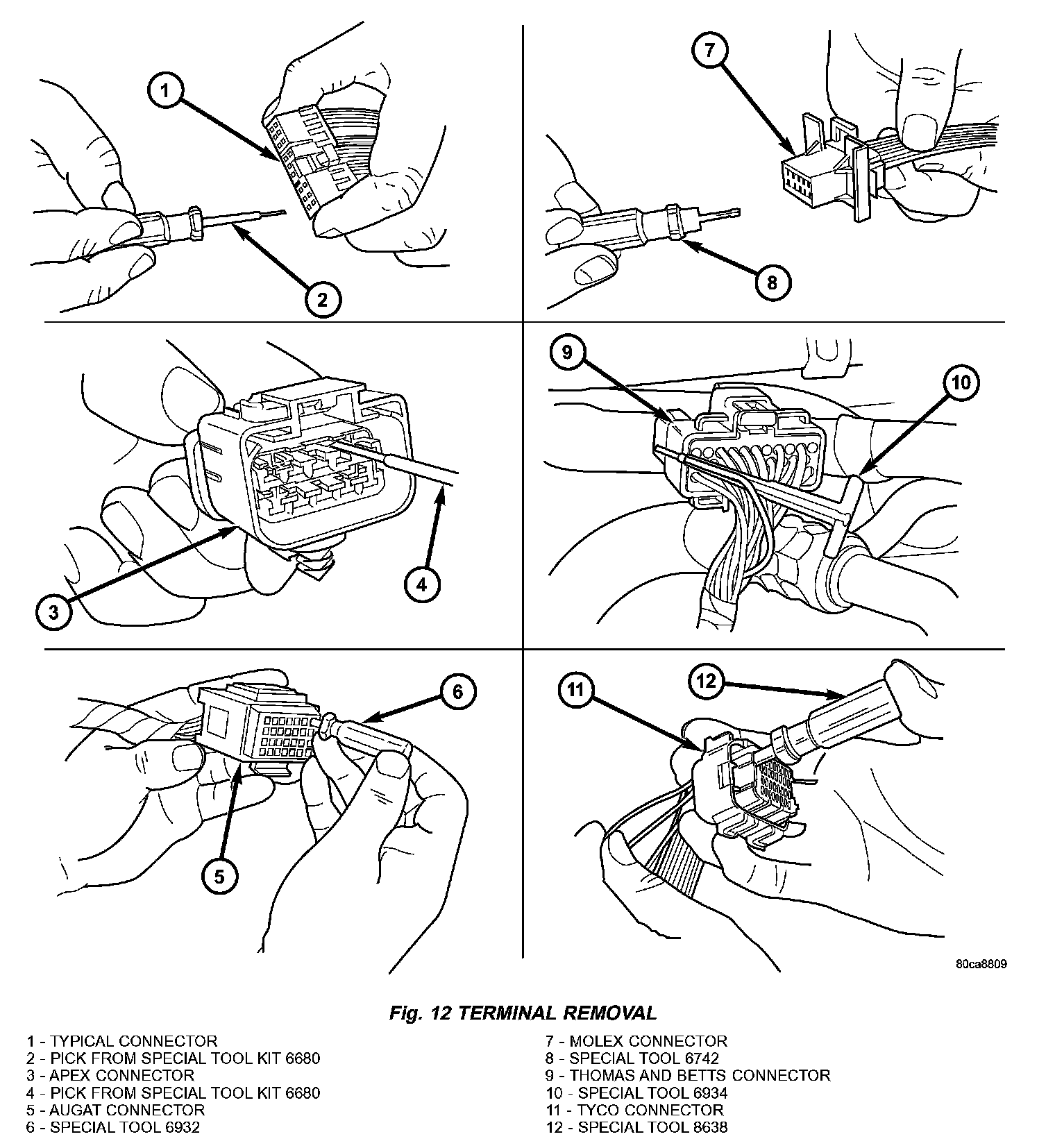 6. Position the connector locking finger away from the terminal using the proper special tool. Pull on the wire to remove the terminal from the connector (Fig. 12).