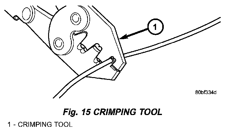 4. Using crimping tool, Mopar p/n 05019912AA, crimp the splice clip and wires together (Fig. 15).