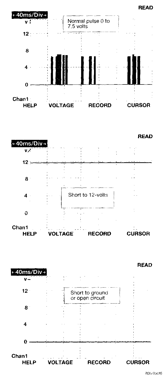 The bus messages are transmitted at a rate averaging 10800 bits per second. Since there is only voltage present when the modules transmit and the message length is only about 500 milliseconds, it is ineffective to try and measure the bus activity with a conventional voltmeter. The preferred method is to use the DRBIII lab scope. The 12 volt square wave selection on the 20-volt scale provides a good view of the bus activity. Voltage on the bus should pulse between zero and about seven and a half volts. Refer to the following illustration for some typical displays.