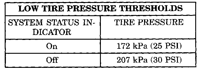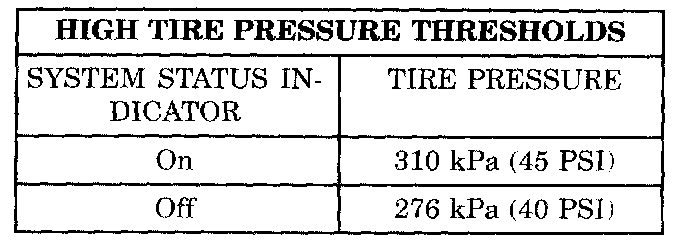 The EVIC will monitor the tire pressure signals from the tire Sensor/Transmitters and determine if any tire has gone below the low-pressure threshold or exceeded the high-pressure threshold. Refer to the table below: