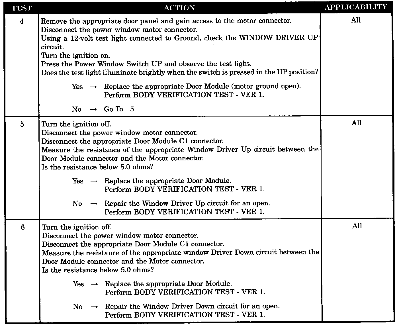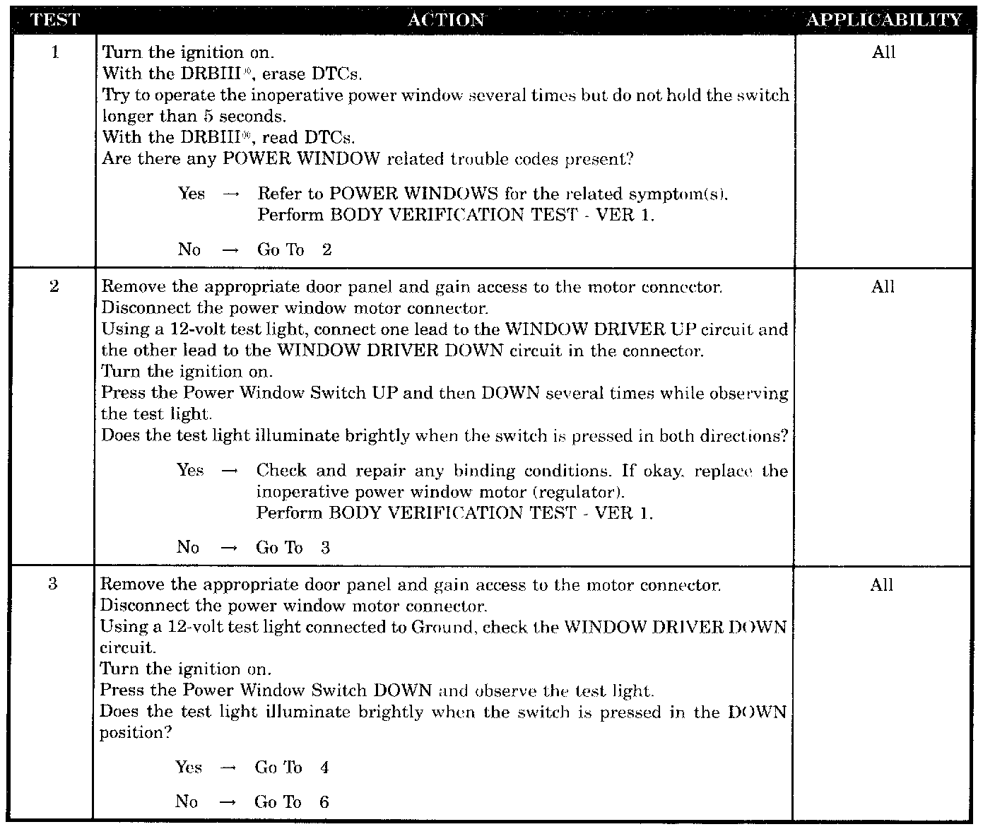 Home >> Chrysler >> 2004 >> Pacifica V6-3.5L VIN 4 >> Repair and Diagnosis >> Relays and Modules >> Relays and Modules - Powertrain Management >> Relays and Modules - Computers and Control Systems >> Body Control Module >> Testing and Inspection >> Symptom Related Diagnostic Procedures >> Power Windows >> One Window Motor Inoperative From Any Switch