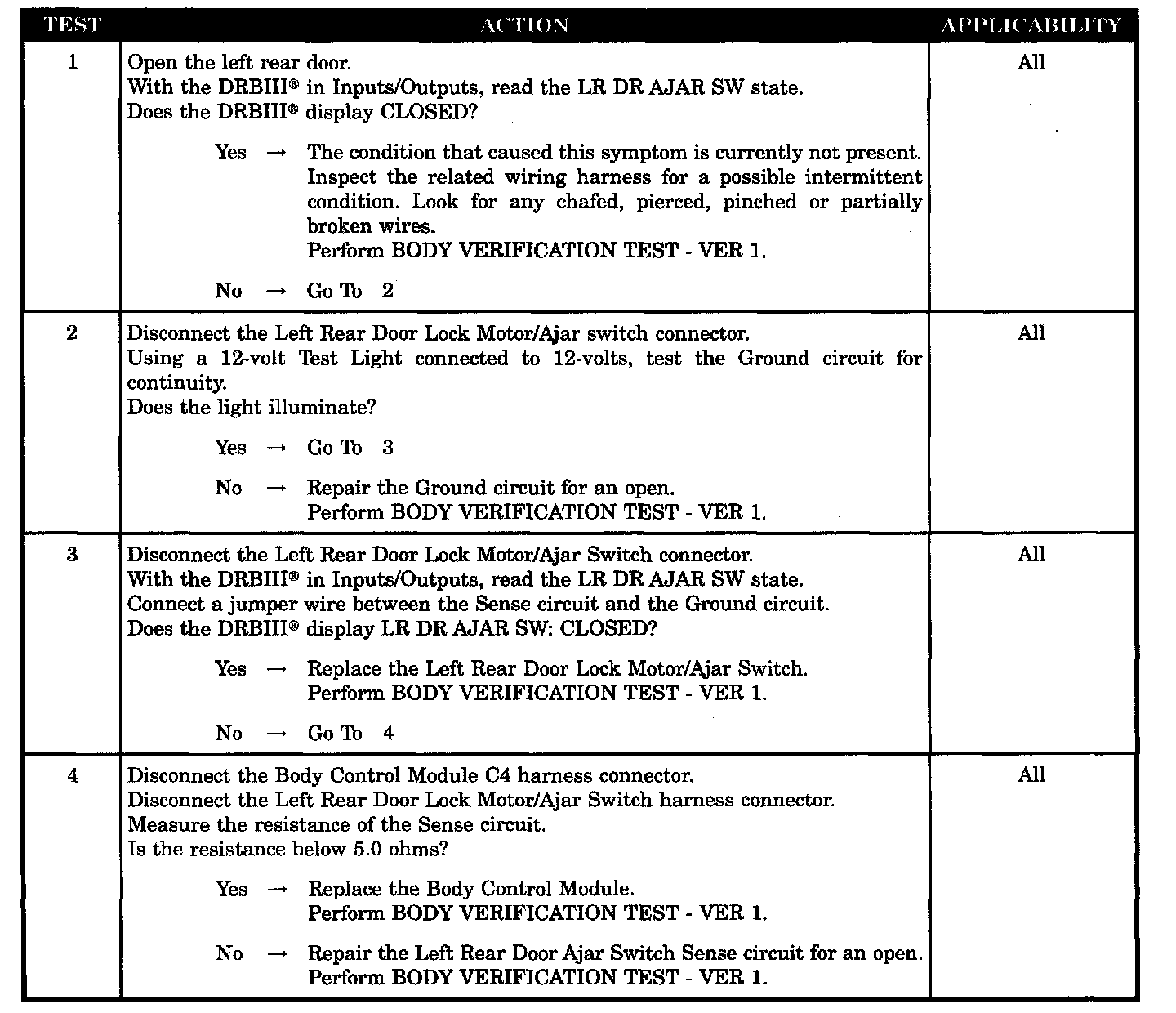 Home >> Chrysler >> 2004 >> Sebring Convertible L4-2.4L VIN X >> Repair and Diagnosis >> Powertrain Management >> Computers and Control Systems >> Relays and Modules - Computers and Control Systems >> Body Control Module >> Testing and Inspection >> Symptom Related Diagnostic Procedures >> Door Ajar System >> Left Rear Door Ajar Circuit Open