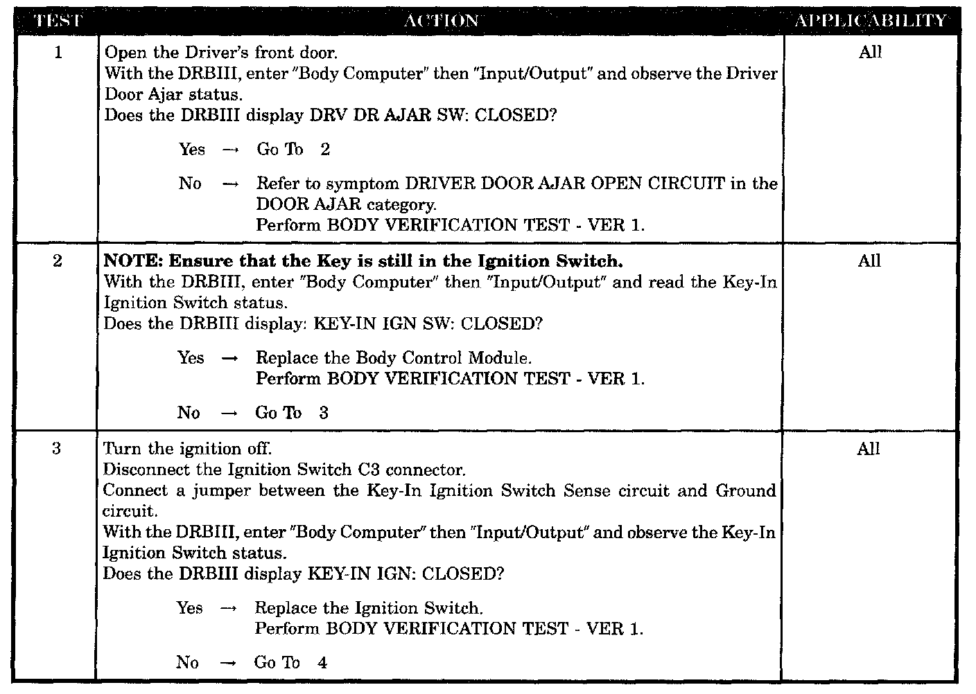 Home >> Chrysler >> 2004 >> Sebring Convertible L4-2.4L VIN X >> Repair and Diagnosis >> Powertrain Management >> Computers and Control Systems >> Relays and Modules - Computers and Control Systems >> Body Control Module >> Testing and Inspection >> Symptom Related Diagnostic Procedures >> Power Door Locks/RKE >> Door Lock Inhibit Inoperative