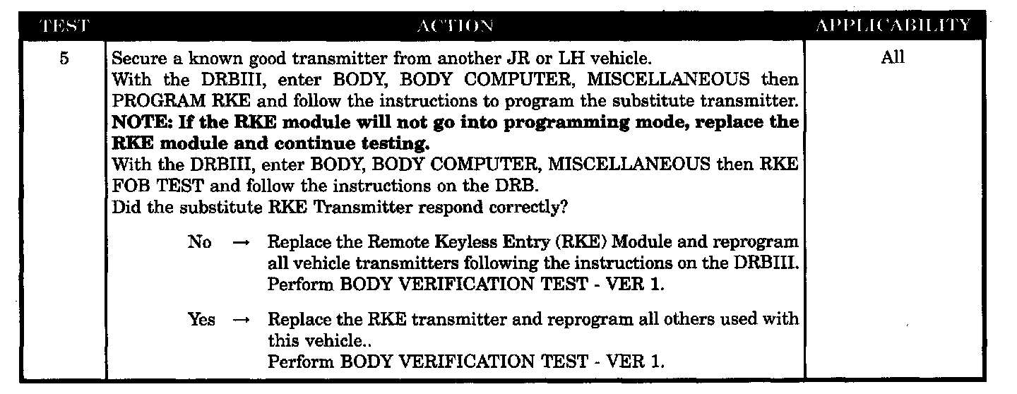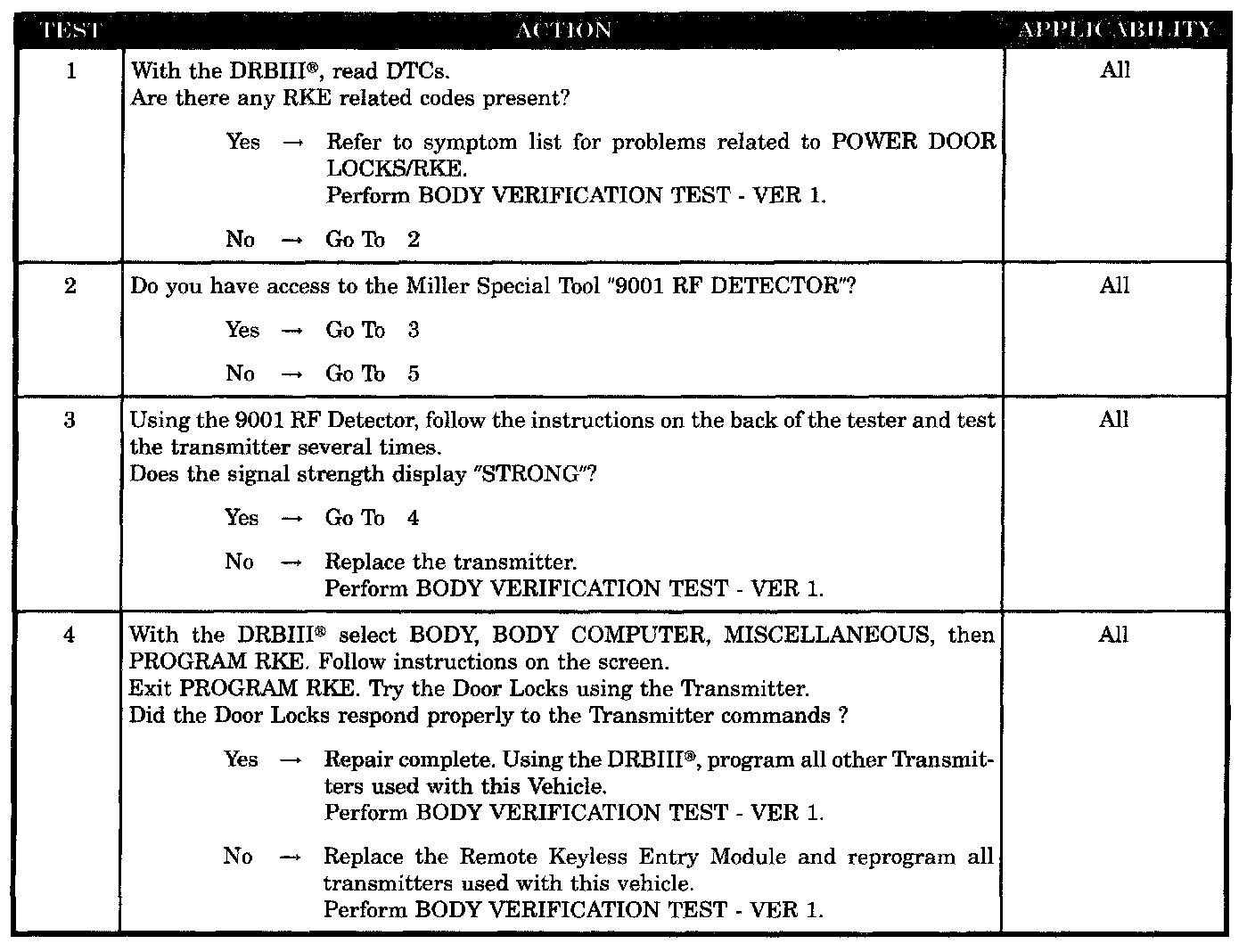 Home >> Chrysler >> 2004 >> Sebring Convertible L4-2.4L VIN X >> Repair and Diagnosis >> Powertrain Management >> Computers and Control Systems >> Relays and Modules - Computers and Control Systems >> Body Control Module >> Testing and Inspection >> Symptom Related Diagnostic Procedures >> Power Door Locks/RKE >> Remote Keyless Entry Problem