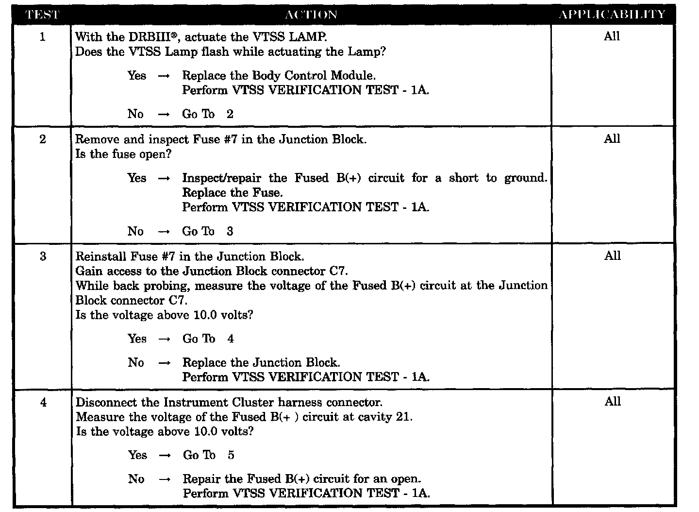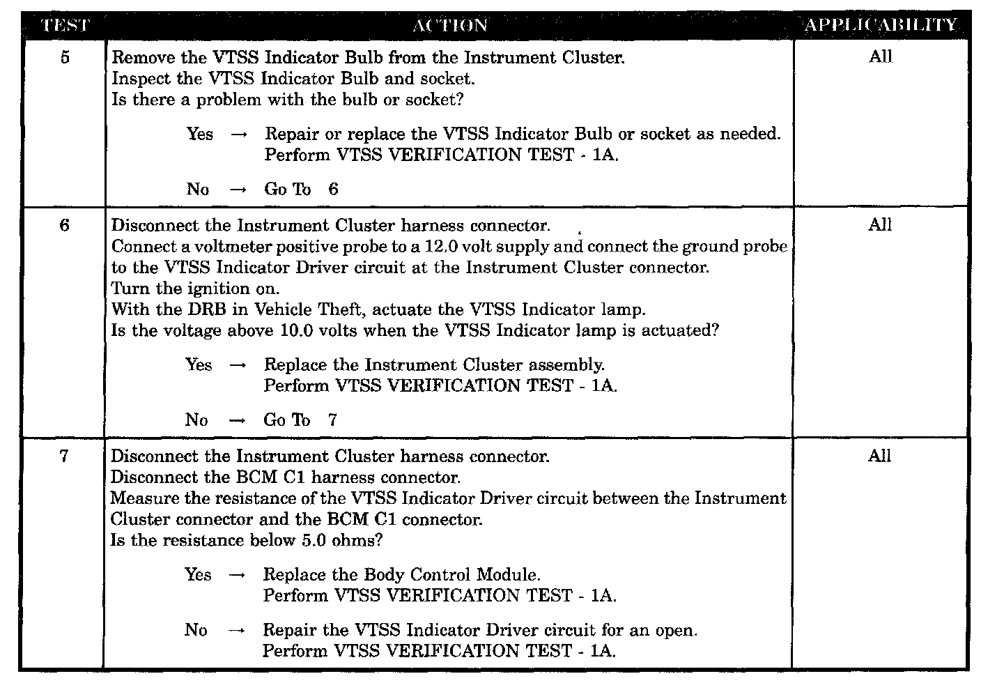 Home >> Chrysler >> 2004 >> Sebring Convertible L4-2.4L VIN X >> Repair and Diagnosis >> Relays and Modules >> Relays and Modules - Powertrain Management >> Relays and Modules - Computers and Control Systems >> Body Control Module >> Testing and Inspection >> Symptom Related Diagnostic Procedures >> Vehicle Theft Security System >> VTSS Indicator Inoperative