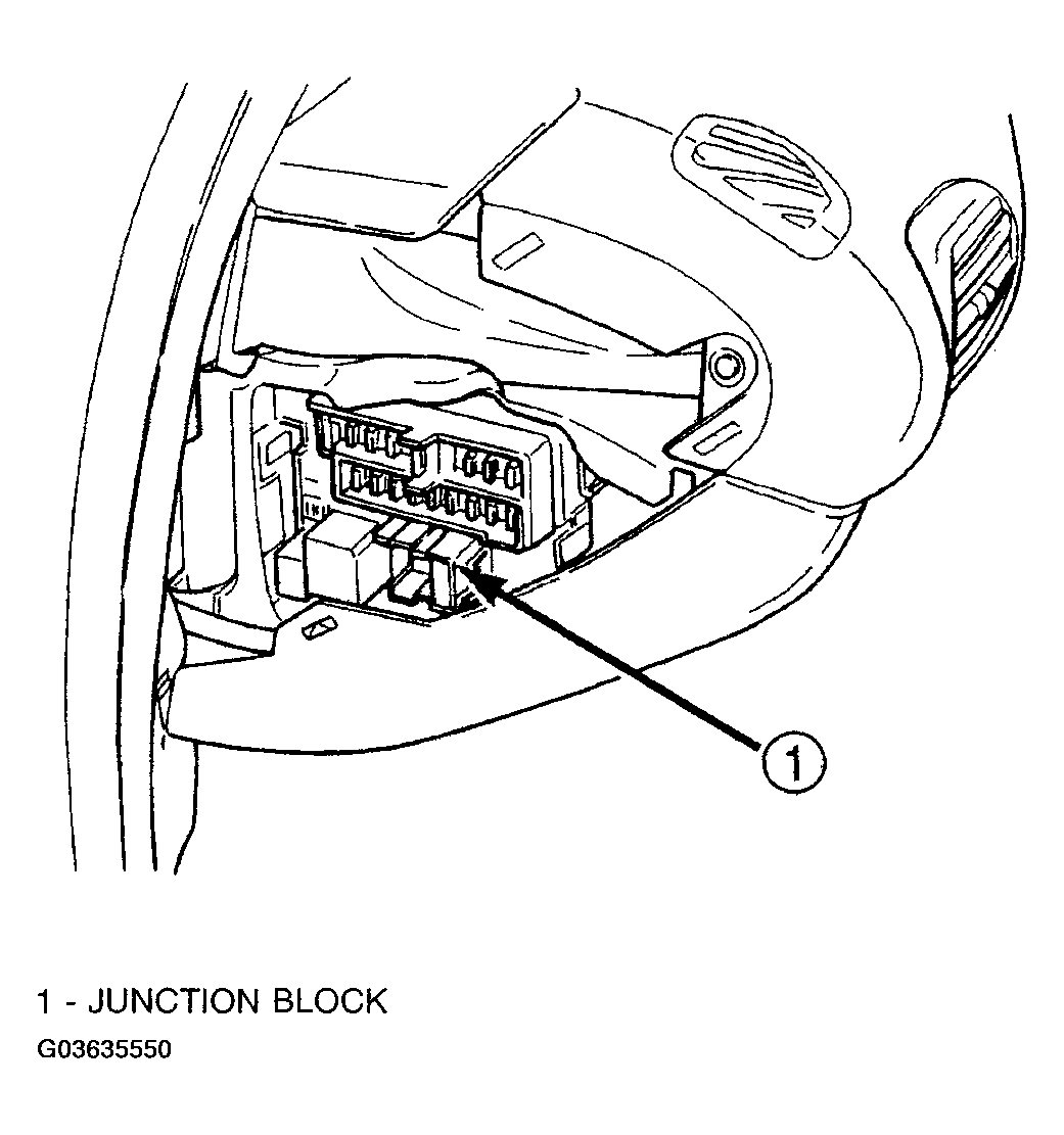 An electrical Junction Block (JB) is located in the left end cap of the instrument panel. The JB combines the functions previously provided by a separate fuse block module and relay center. It also serves to simplify and centralize numerous electrical components, as well as to distribute electrical current to many of the accessory systems in the vehicle. It eliminates the need for numerous splice connections and serves in place of a bulkhead connector between many of the engine compartment, instrument panel, and body wire harnesses.