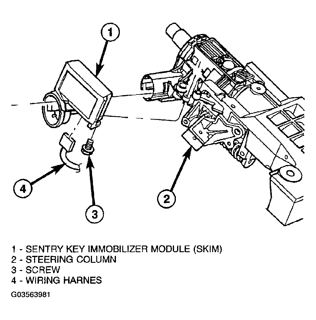 - Disconnect the steering column wire harness connector from the Sentry Key Immobilizer Module (SKIM)