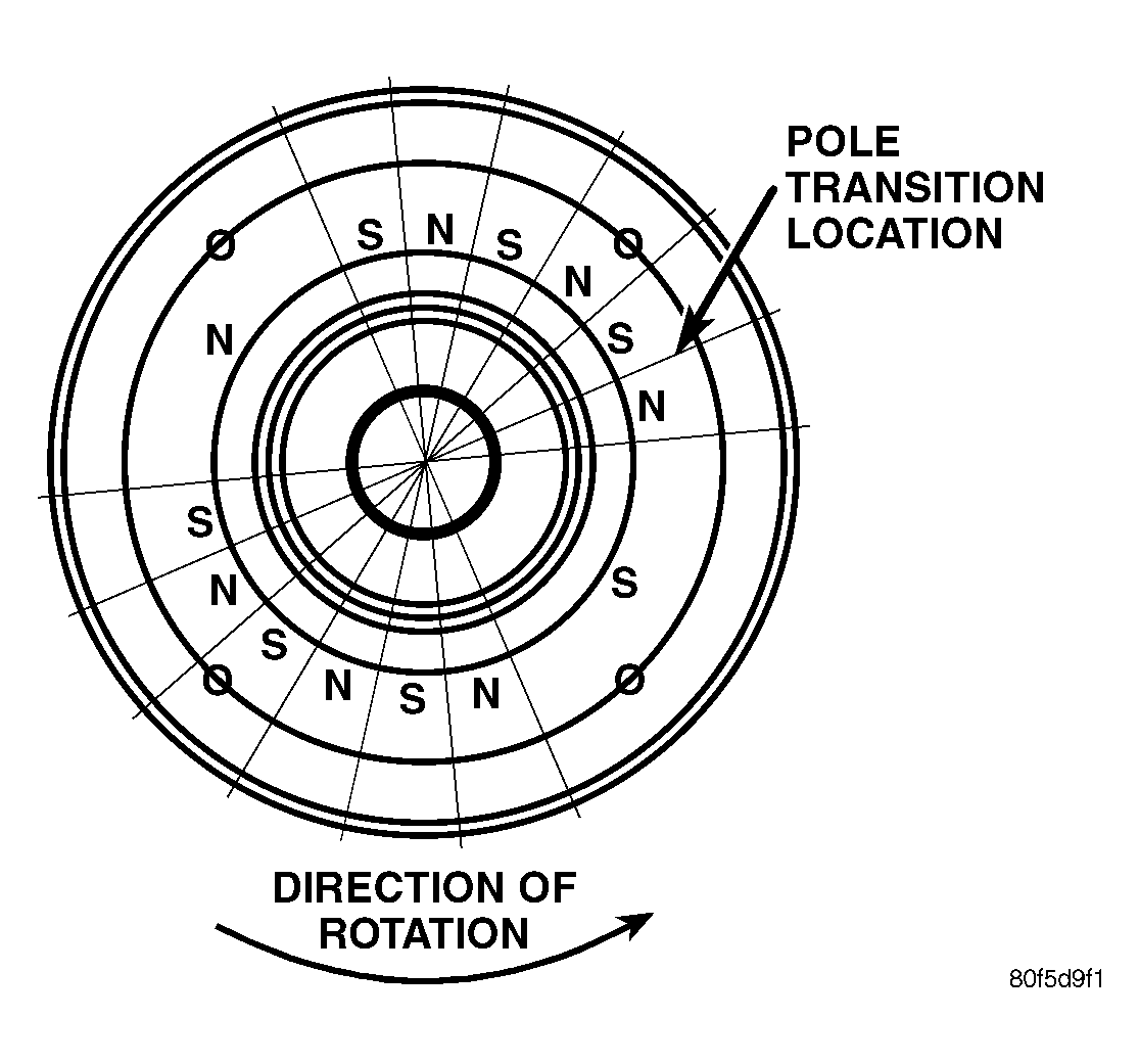 On 2.0/2.4L engines a target magnet attaches to the rear of the camshaft and indexes to the correct position. The target magnet has fourteen different poles arranged in an asymmetrical pattern. As the target magnet rotates, the camshaft position sensor senses the change in polarity. See Fig 2.
