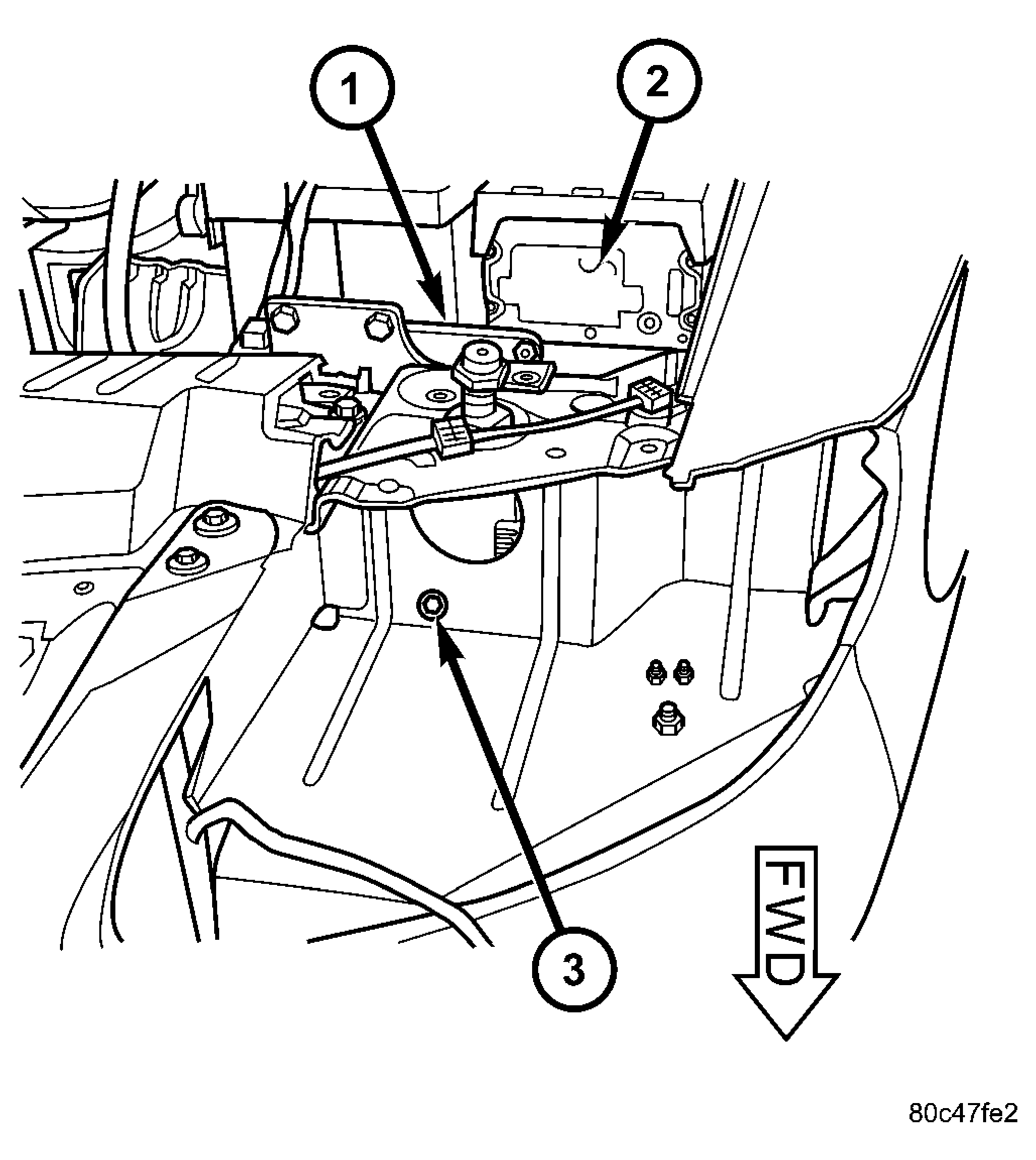 1 - ENGINE CONTROL MODULE (ECM) 2 - INTEGRATED POWER MODULE 3 - ECM LOWER MOUNTING BOLT - Remove ECM upper mounting bolts. See Fig 2.