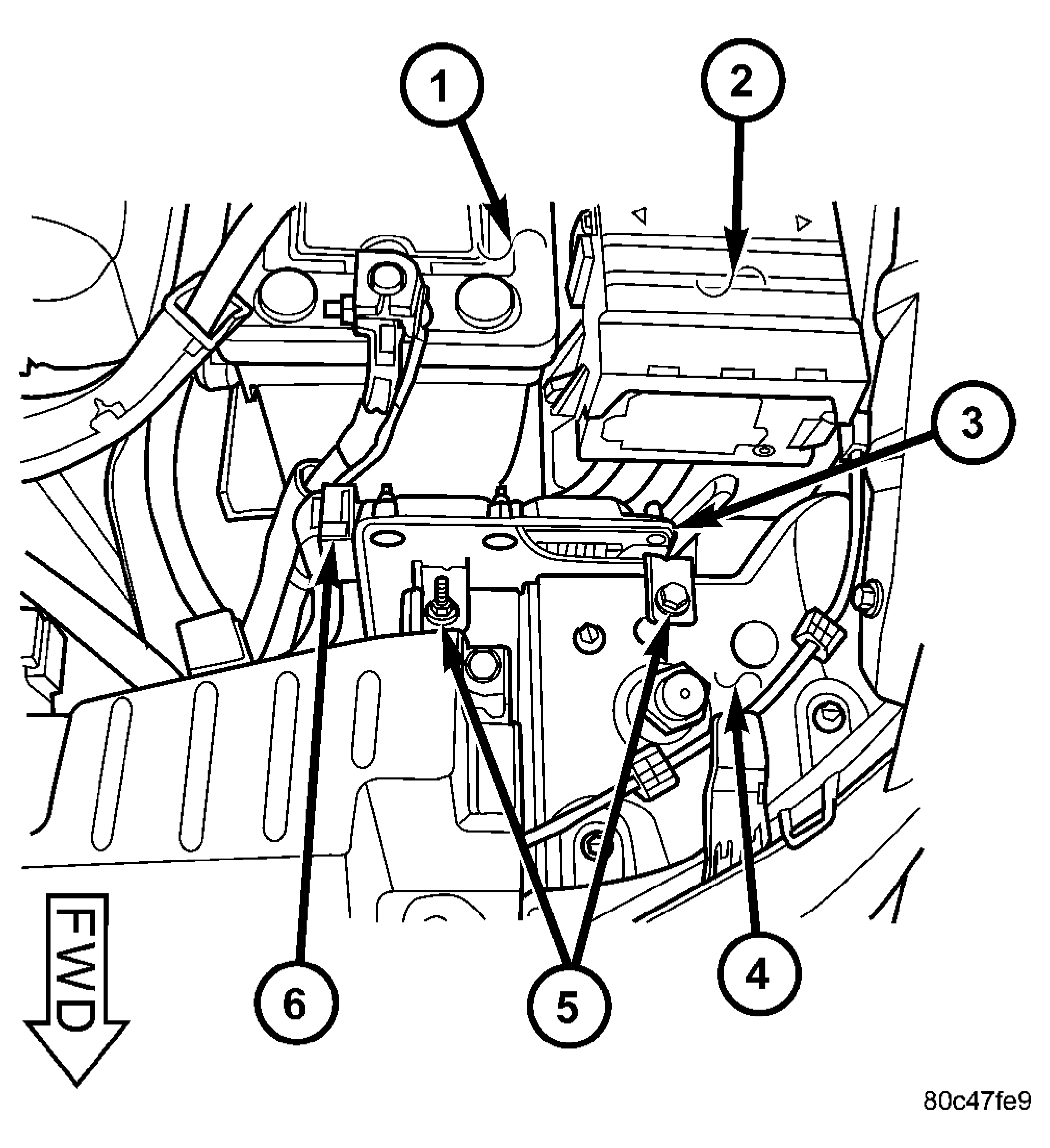 1 - BATTERY 2 - INTEGRATED POWER MODULE 3 - ENGINE CONTROL MODULE 4 - RADIATOR SUPPORT 5 - ECM UPPER MOUNTING BOLTS 6 - ECM ELECTRICAL CONNECTORS - Lift ECM from radiator support.