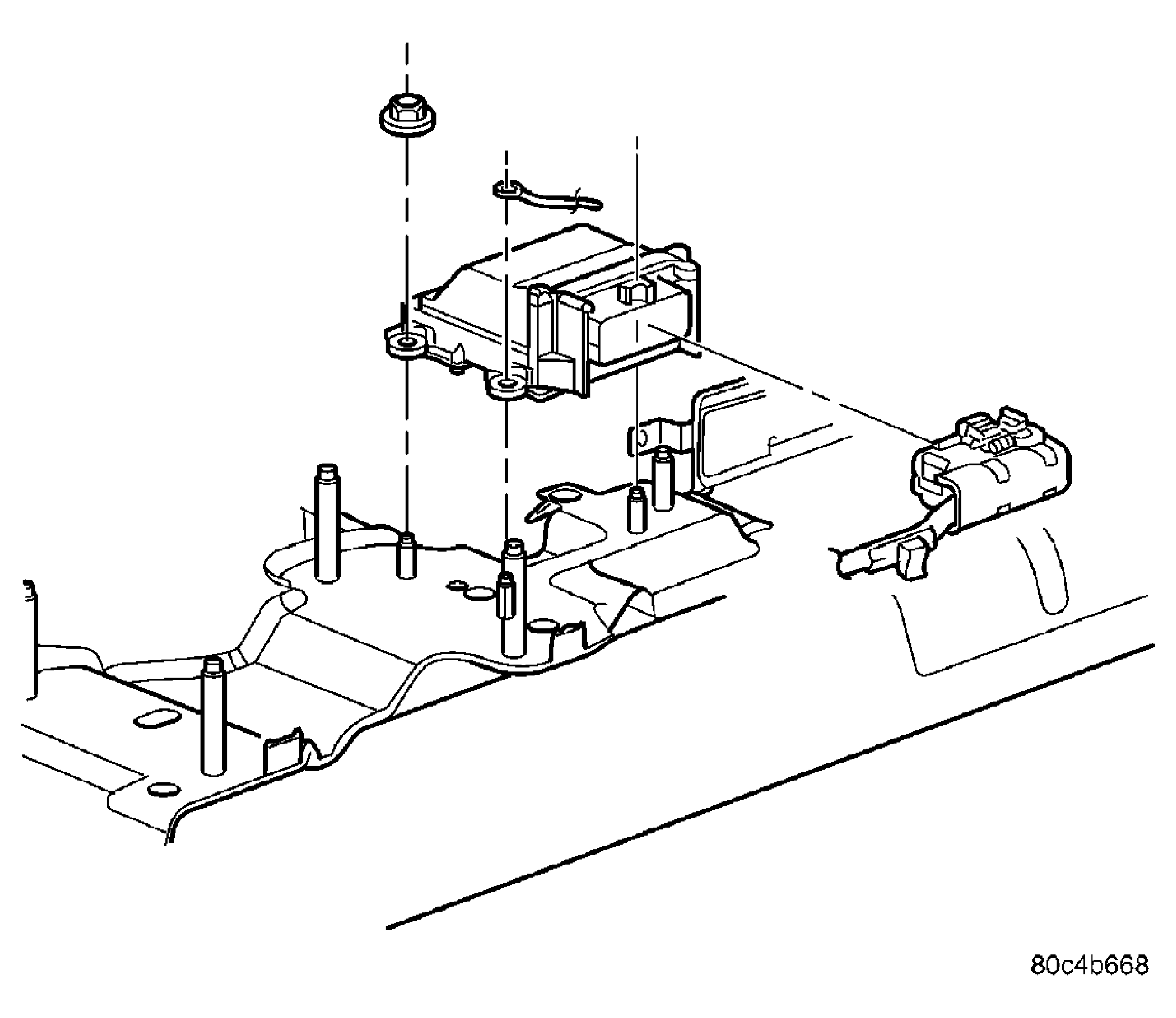 - Position ORC (arrow pointing forward) in the console floor bracket, replace ground eyelet, and attach the nuts and tighten to 9.6 to 14 N.m (85 to 125 in. lbs.) torque. See Figure.NOTE: Place the ground eyelet over the front (towards the front of the vehicle) weld stud when reattaching the ORC.