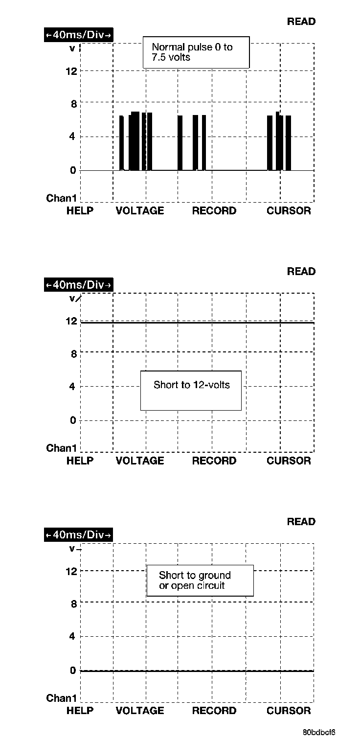 The bus messages are transmitted at a rate averaging 10,800 bits per second. Since there is only voltage present when the modules transmit and the message length is only about 500 milliseconds, it is ineffective to try and measure the bus activity with a conventional voltmeter. The preferred method is to use the DRBIII(R) lab scope. The 12 v square wave selection on the 20-volt scale provides a good view of the bus activity. Voltage on the bus should pulse between zero and about seven and a half volts. Refer to the figure for some typical displays.