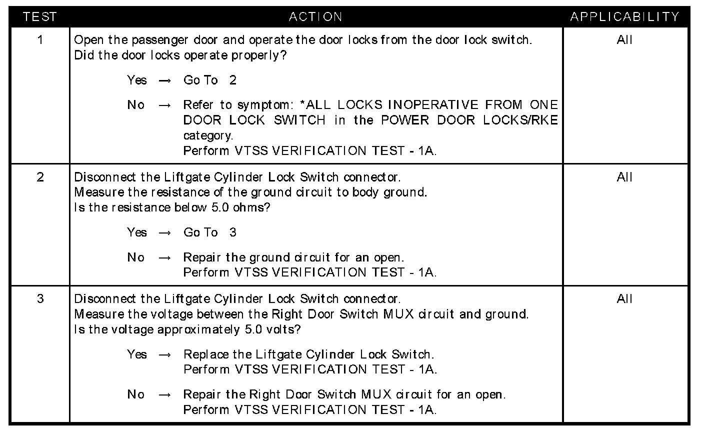 Home >> Chrysler >> 2005 >> PT Cruiser L4-2.4L VIN X >> Repair and Diagnosis >> Powertrain Management >> Computers and Control Systems >> Relays and Modules - Computers and Control Systems >> Body Control Module >> Testing and Inspection >> Symptom Related Diagnostic Procedures >> Vehicle Theft Security System >> VTSS Fails to Arm From Liftgate Cylinder Lock Switch Export Only)