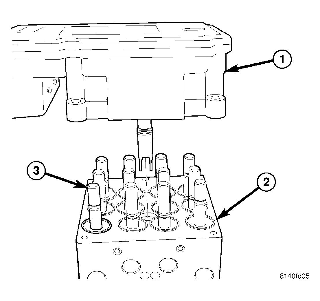 - Align ABM solenoids and pump/motor wiring connector with HCU valves and connector passage. See Figure. Slide ABM onto HCU.