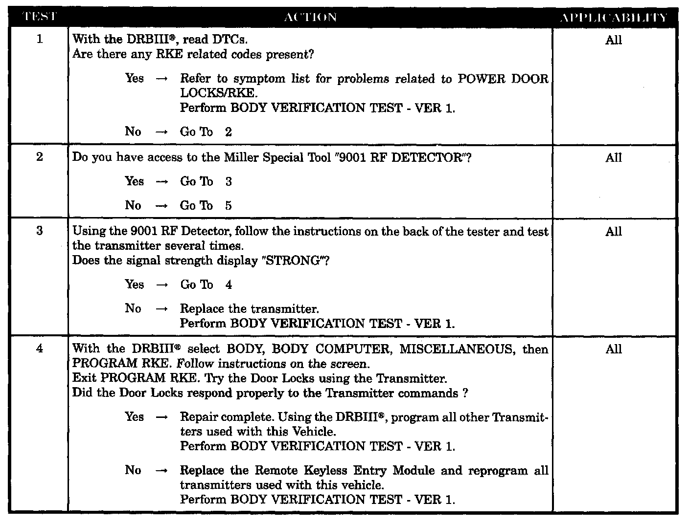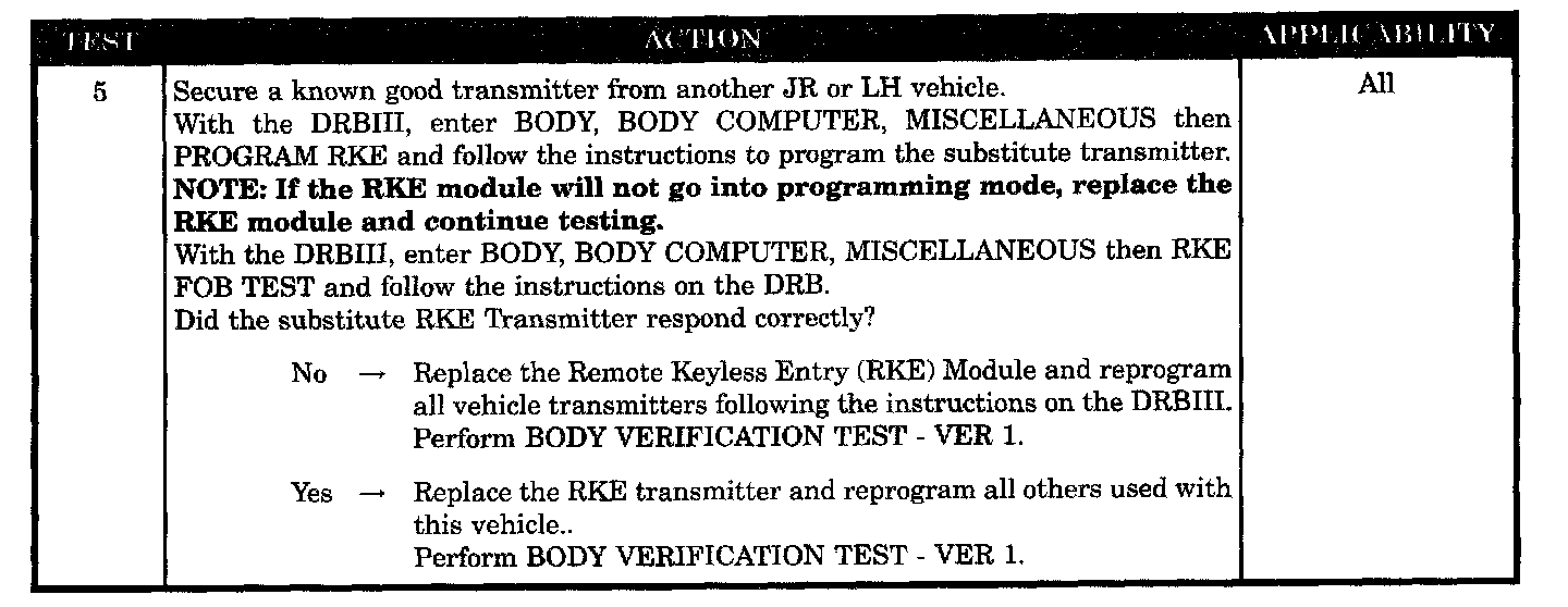 Home >> Chrysler >> 2005 >> Sebring Convertible L4-2.4L VIN X >> Repair and Diagnosis >> Powertrain Management >> Computers and Control Systems >> Body Control Module >> Testing and Inspection >> Symptom Related Diagnostic Procedures >> Power Door Locks/RKE >> Remote Keyless Entry Problem
