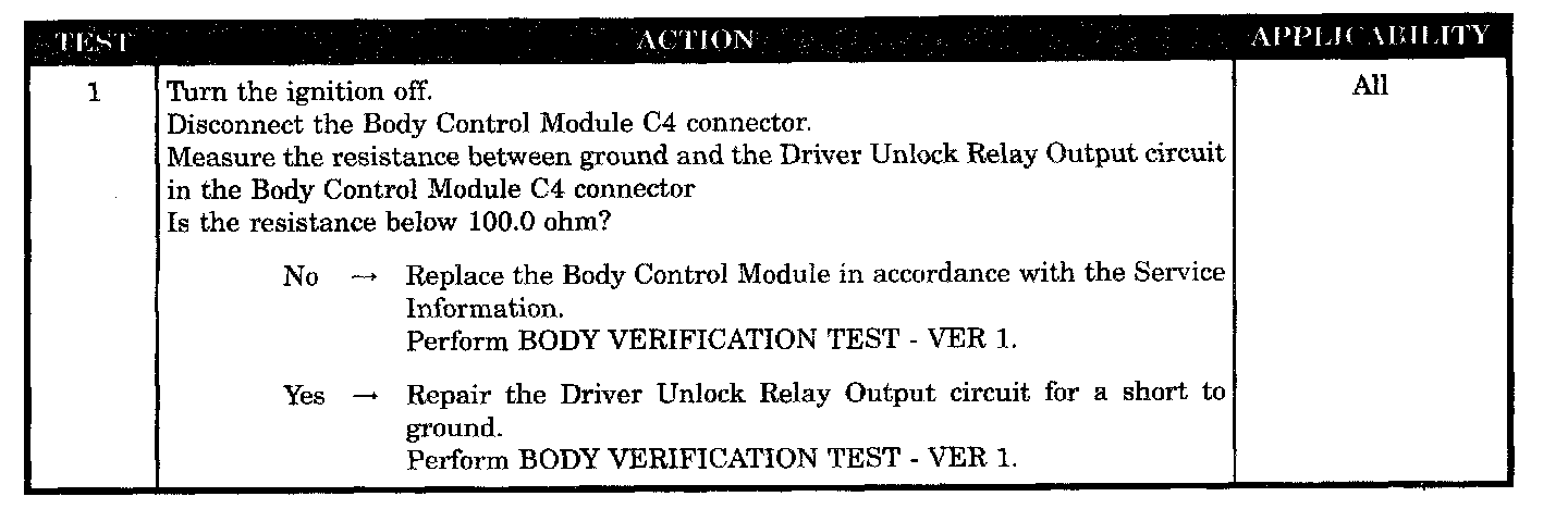 DRIVER DOOR FAILS TO UNLOCK FROM ANY SWITCH
