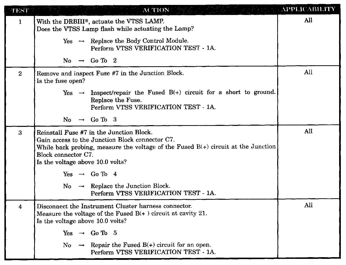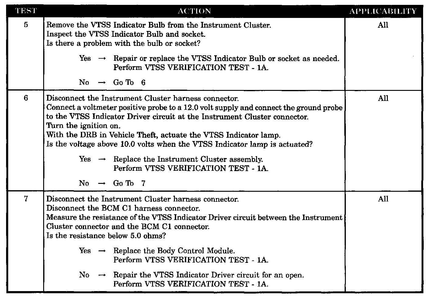 Home >> Chrysler >> 2005 >> Sebring Convertible L4-2.4L VIN X >> Repair and Diagnosis >> Powertrain Management >> Computers and Control Systems >> Relays and Modules - Computers and Control Systems >> Body Control Module >> Testing and Inspection >> Symptom Related Diagnostic Procedures >> Vehicle Theft Security System >> VTSS Indicator Inoperative