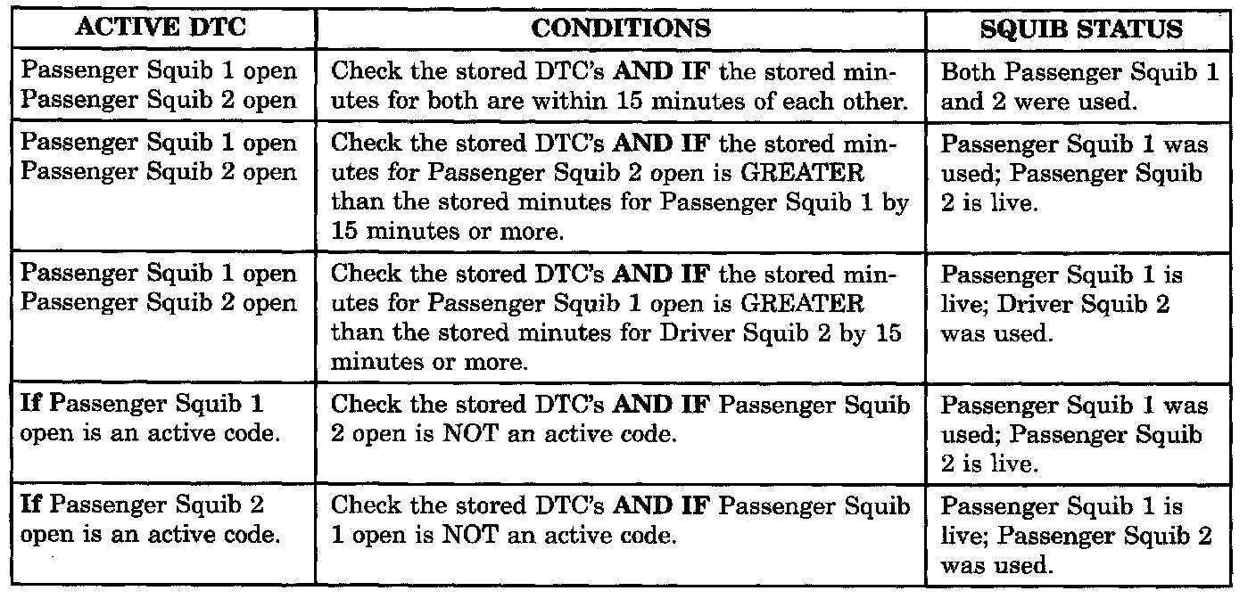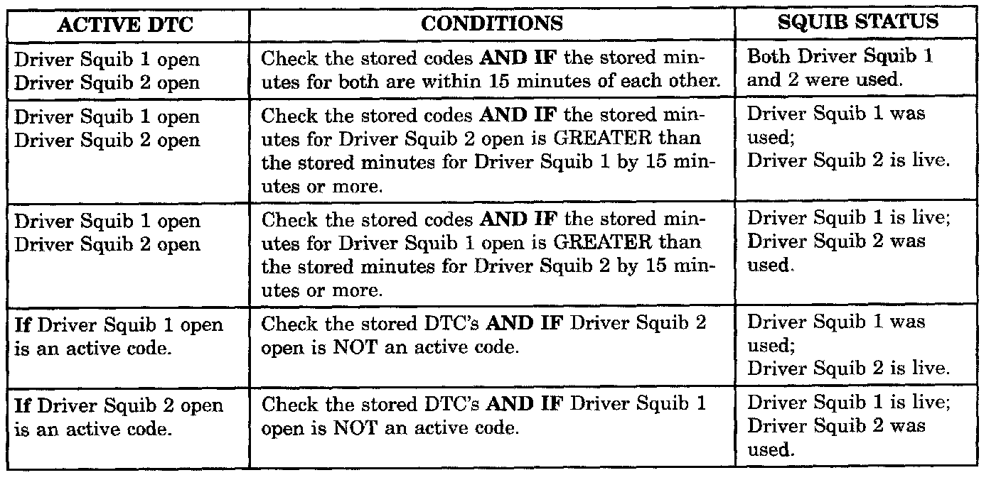 Airbag codes are automatically stored in the ACM's memory as soon as the malfunction is detected. A stored code indicates there was an active code present at some time. However, the code currently may not be present as an active code. When a trouble code occurs, the airbag warning indicator illuminates for 12 seconds minimum (even if the problem existed for less than 12 seconds). The code is stored, along with the time in minutes it was active, and the number of times the ignition has been cycled since the problem was last detected.The minimum time shown for any code will be one minute, even if the code was actually present for less than one minute. Thus, the time shown for a code that was present for two minutes 13 seconds, for example, would be three minutes. If a malfunction is detected a diagnostic trouble code is stored and will remain stored. When and if the malfunction ceases to exist, an ignition cycle count will be initiated for that code. If the ignition cycle count reaches 100 without a reoccurrence of the same malfunction, the diagnostic trouble code is erased and that ignition cycle counter is reset to zero. If the malfunction reoccurs before the count reaches 100, then the ignition cycle counter will be reset and the diagnostic trouble code will continue to be a stored code. If a malfunction is not active while performing a diagnostic test procedure, the active code diagnostic test will not locate the source of the problem. In this case, the stored code can indicate an area to inspect. It no obvious problems are found, erase stored codes, and with the ignition on wiggle the wire harness and connectors, rotate the steering wheel from stop to stop. Recheck for codes periodically as you work through the system. This procedure may uncover a malfunction that is difficult to locate.
