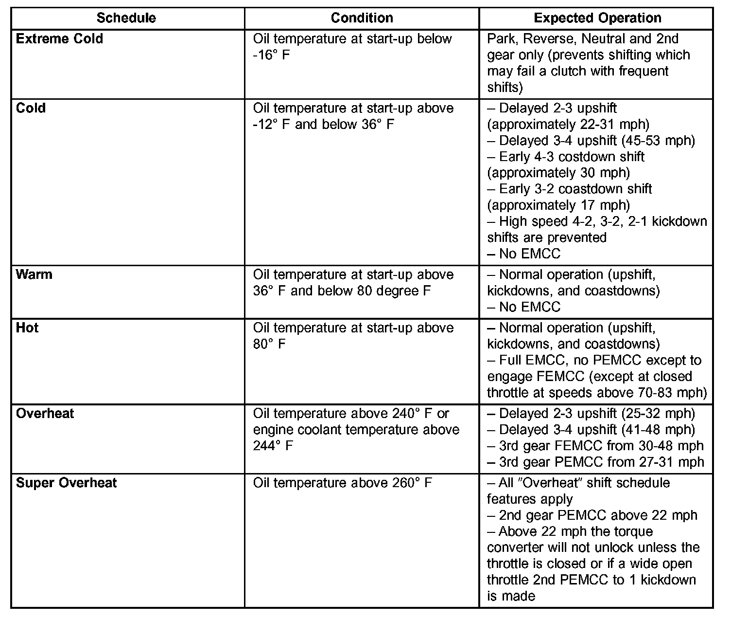 As driving conditions change, the PCM appropriately adjusts the shift schedule. Refer to the chart above to determine the appropriate operation expected, depending on driving conditions.