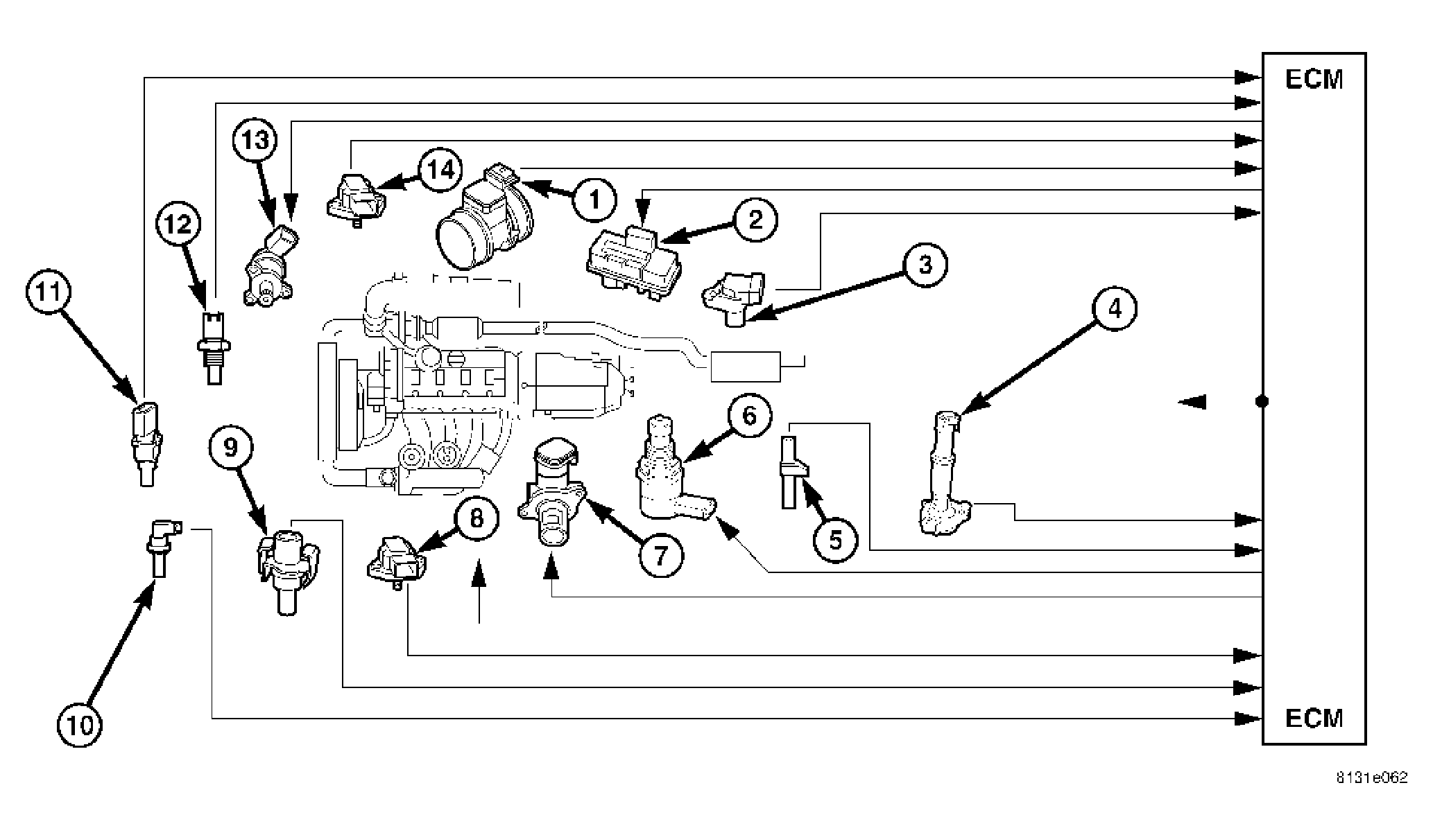 | 1 - MASS AIR FLOW SENSOR | 8 - CHARGE AIR PRESSURE SENSOR |