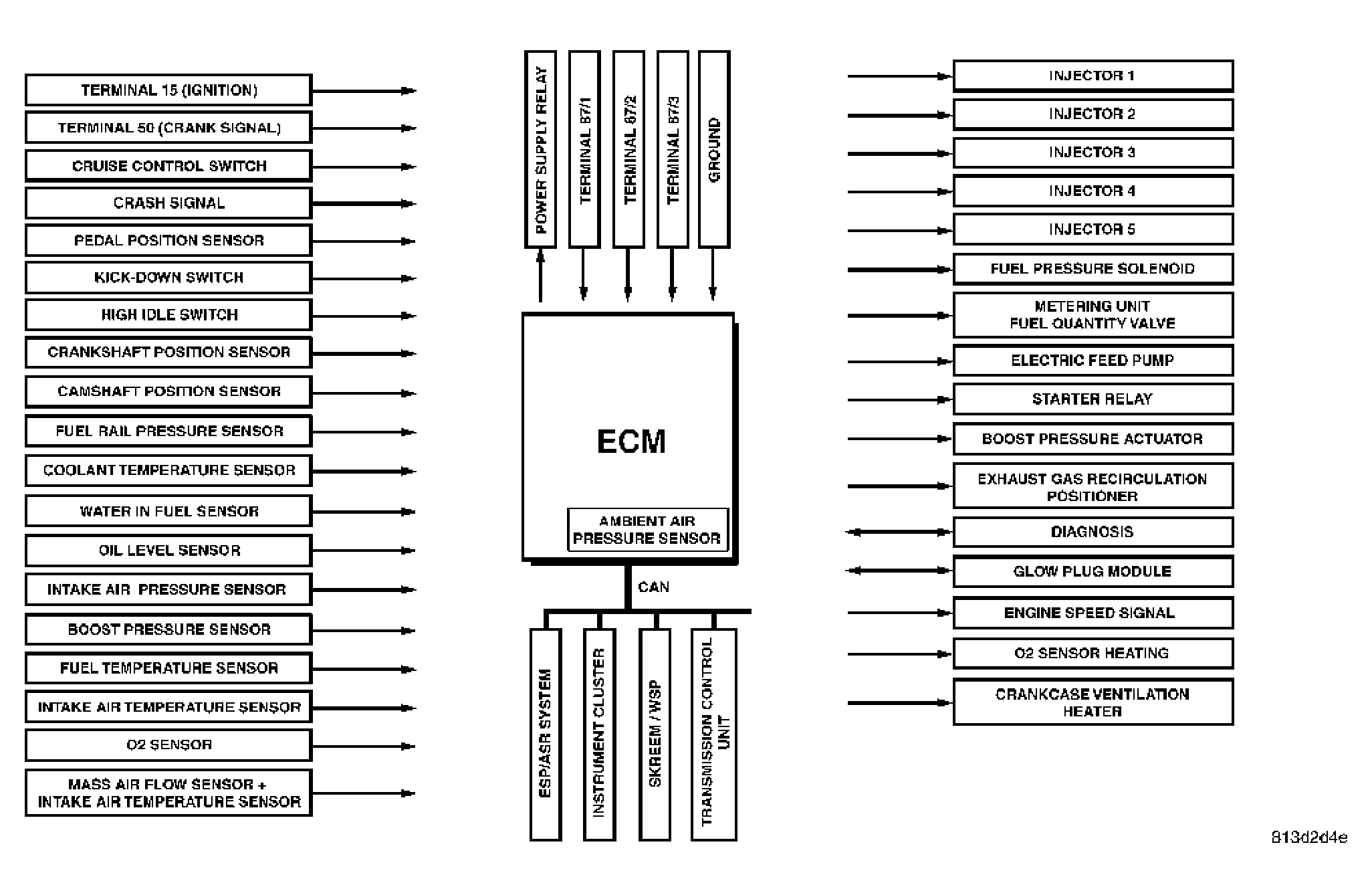 - Individual cylinder torque control for smooth engine running: using the crankshaft position sensor signals, the ECM detect non-uniform engine running results from uneven torque contributions of the individual cylinders and adjust the injection quantities of the individual injectors so that all cylinders make the same torque contribution
