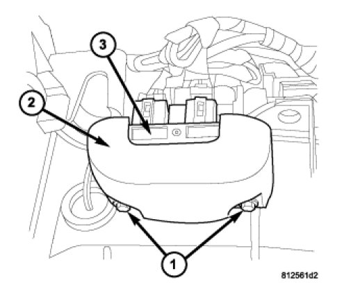 2. If equipped with a trim cover (2), remove the two screws (1) that secure the trim cover over the blower motor power module (3) located below the right side of the instrument panel and remove the cover.