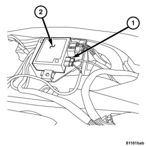 2. Disconnect the sentry key antenna ring electrical connector (1) from the sentry key remote entry module (2).