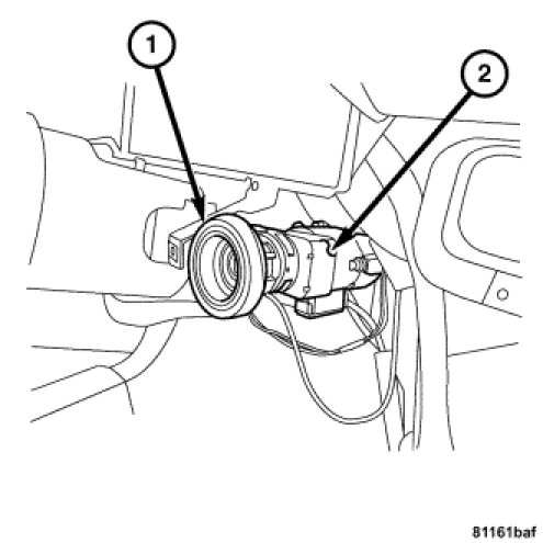 3. Pull to remove the sentry key antenna ring (1) from the ignition switch key cylinder (2).